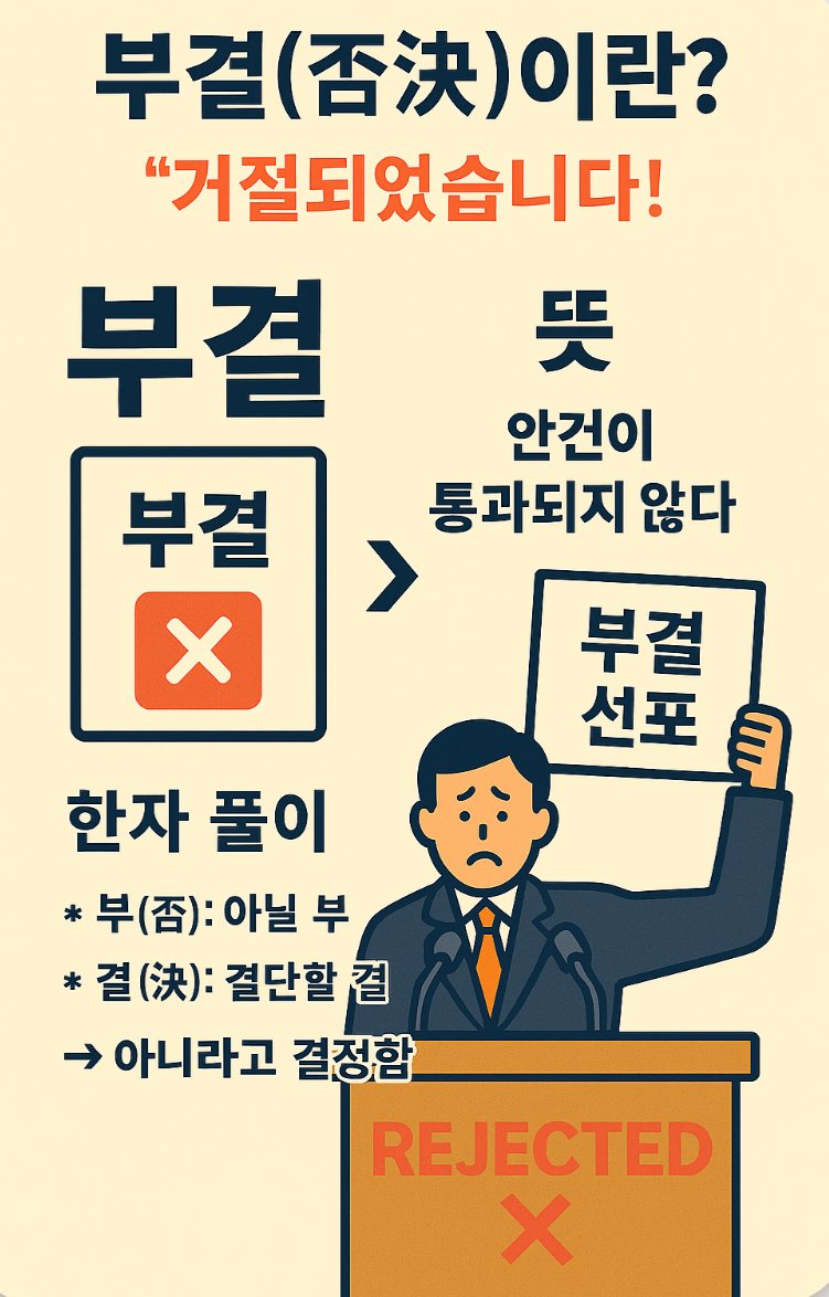반대로 부결은 "안건이 통과되지 못했다"는 뜻입니다. 반대하는 사람이 더 많거나, 찬성하는 사람이 기준에 미치지 못해서 안건이 무효가 된 상황을 말합니다.