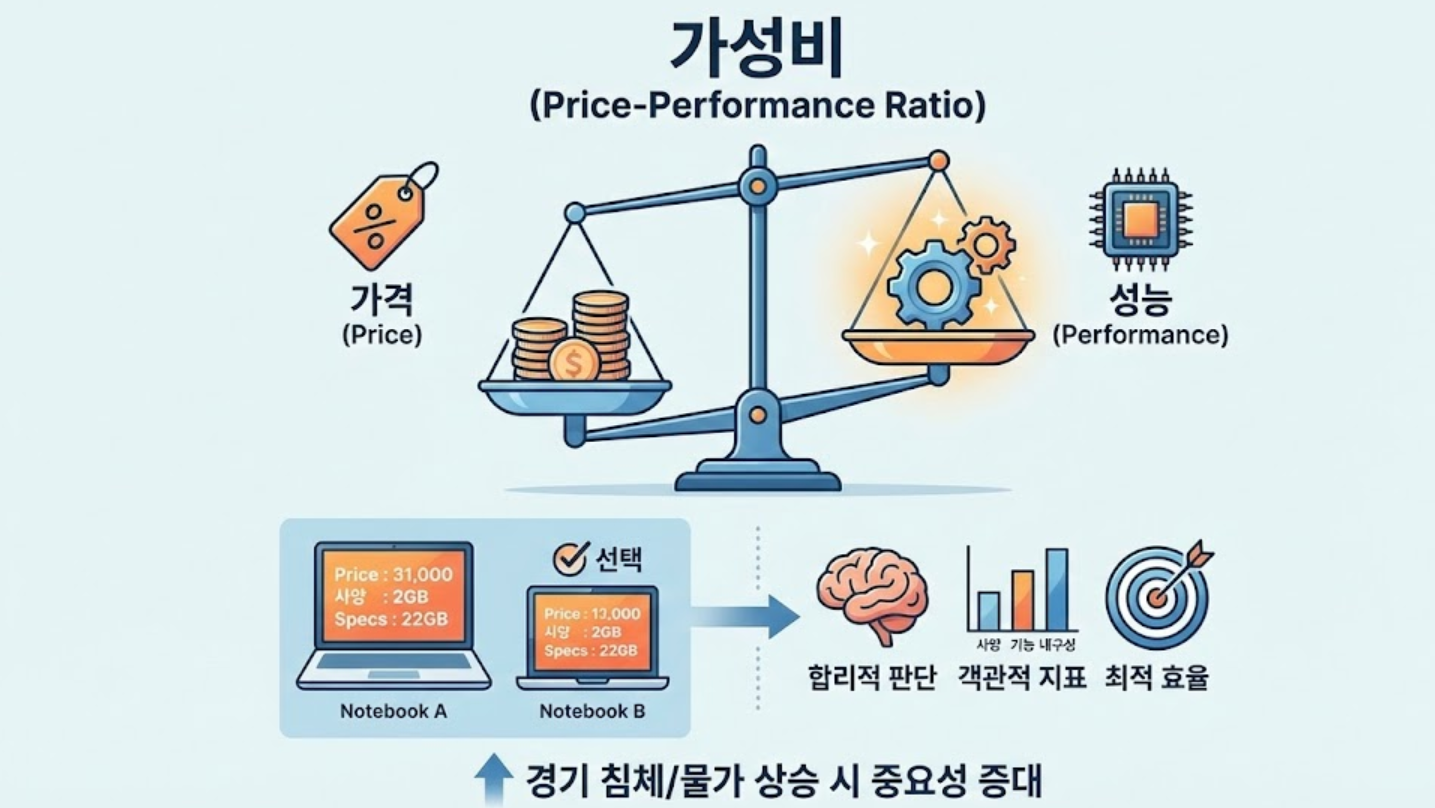 '가성비'는 '가격 대비 성능'의 줄임말로, 우리가 오랫동안 소비를 결정하는 데 있어 가장 중요한 기준 중 하나였습니다. 지불한 가격에 비해 제품이나 서비스가 제공하는 성능이나 기능이 얼마나 뛰어난지를 객관적으로 평가하는 개념이죠. 예를 들어, 비슷한 성능의 노트북이라면 더 저렴한 제품을 선택하는 것이 바로 가성비를 따지는 소비 방식입니다.