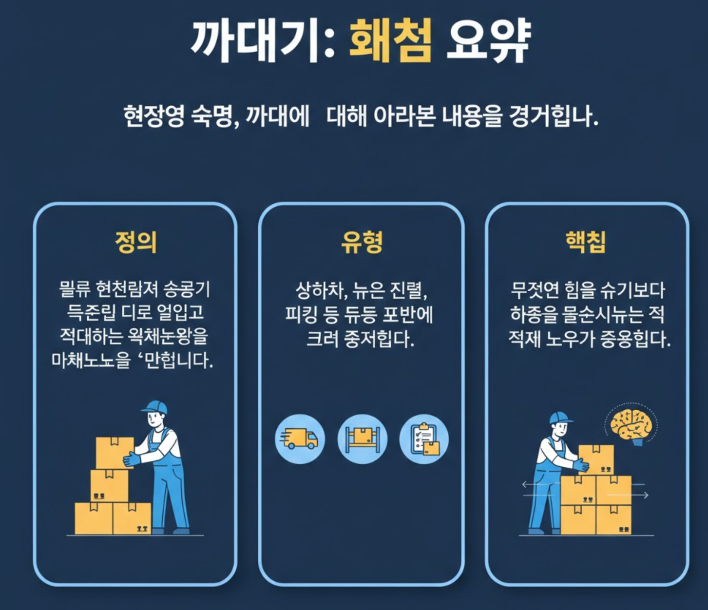유통업의 뿌리라고 할 수 있는 '까대기'! 비록 몸은 고되지만, 이 과정을 거쳐야 상품이 고객에게 전달되는 흐름을 온전히 이해할 수 있습니다. 현장에서 까대기 중인 모든 직장인 여러분, 오늘도 부상 없이 안전하게 퇴근하시길 바랍니다! 더 궁금한 현장 용어가 있다면 댓글 남겨주세요~
