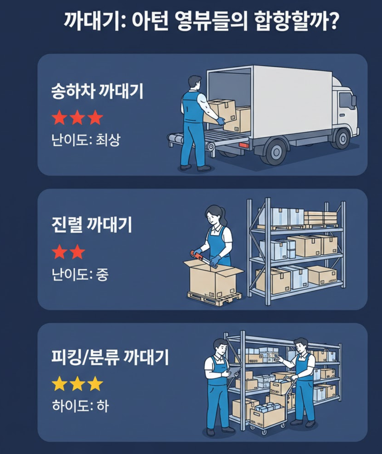 | 상하차 까대기 | 트럭 내부의 물건을 컨베이어로 옮기거나 싣는 작업 | 최상 |