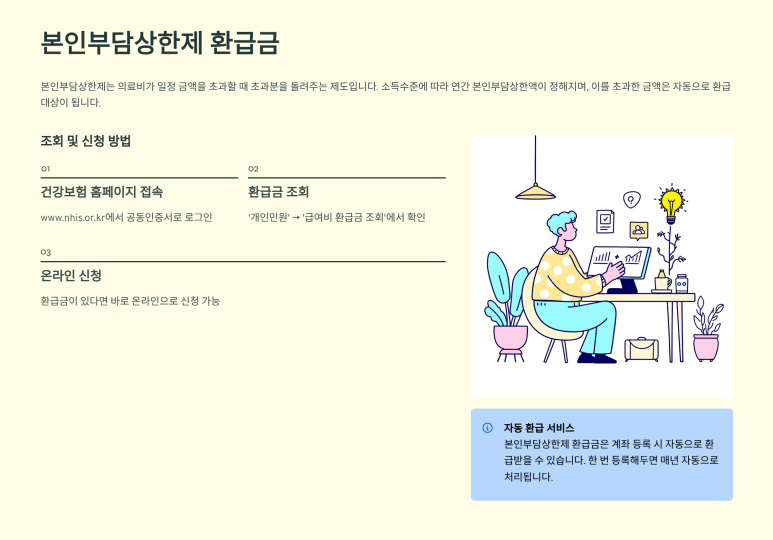 소득 수준에 따라 정해진 연간 본인부담금 상한액을 초과한 경우, 그 초과분을 공단이 직접 환자에게 돌려주는 제도예요. 보통 매년 8월 말부터 정산이 시작됩니다. |