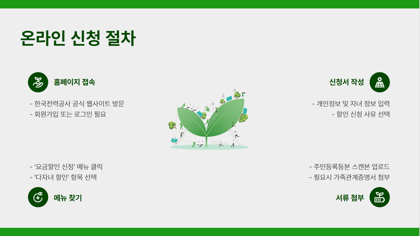 - 온라인 신청: 한국전력공사 홈페이지에서 요금 할인 신청 메뉴로 들어가서 다자녀 할인 신청서를 작성하고, 주민등록등본 등 필수 서류를 첨부하면 끝!