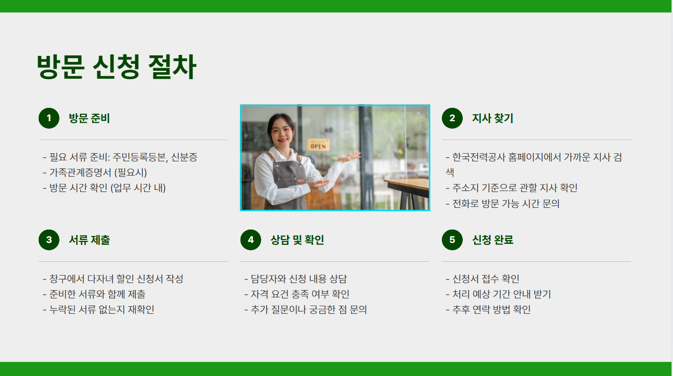 - 방문 신청: 가까운 한국전력공사 지사에 방문해서 직접 서류를 제출할 수도 있습니다.