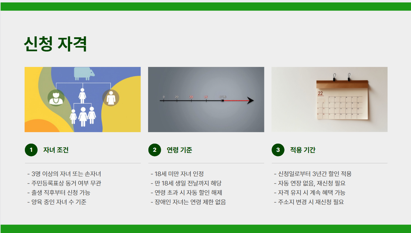 또 하나 알아두셔야 할 건, 출생 이후부터 신청이 가능하고, 할인은 3년 동안 적용된다는 사실입니다. 다만 대가족 할인과는 중복 적용되지 않으니 본인이 어떤 혜택에 해당하는지 확인이 필요합니다.