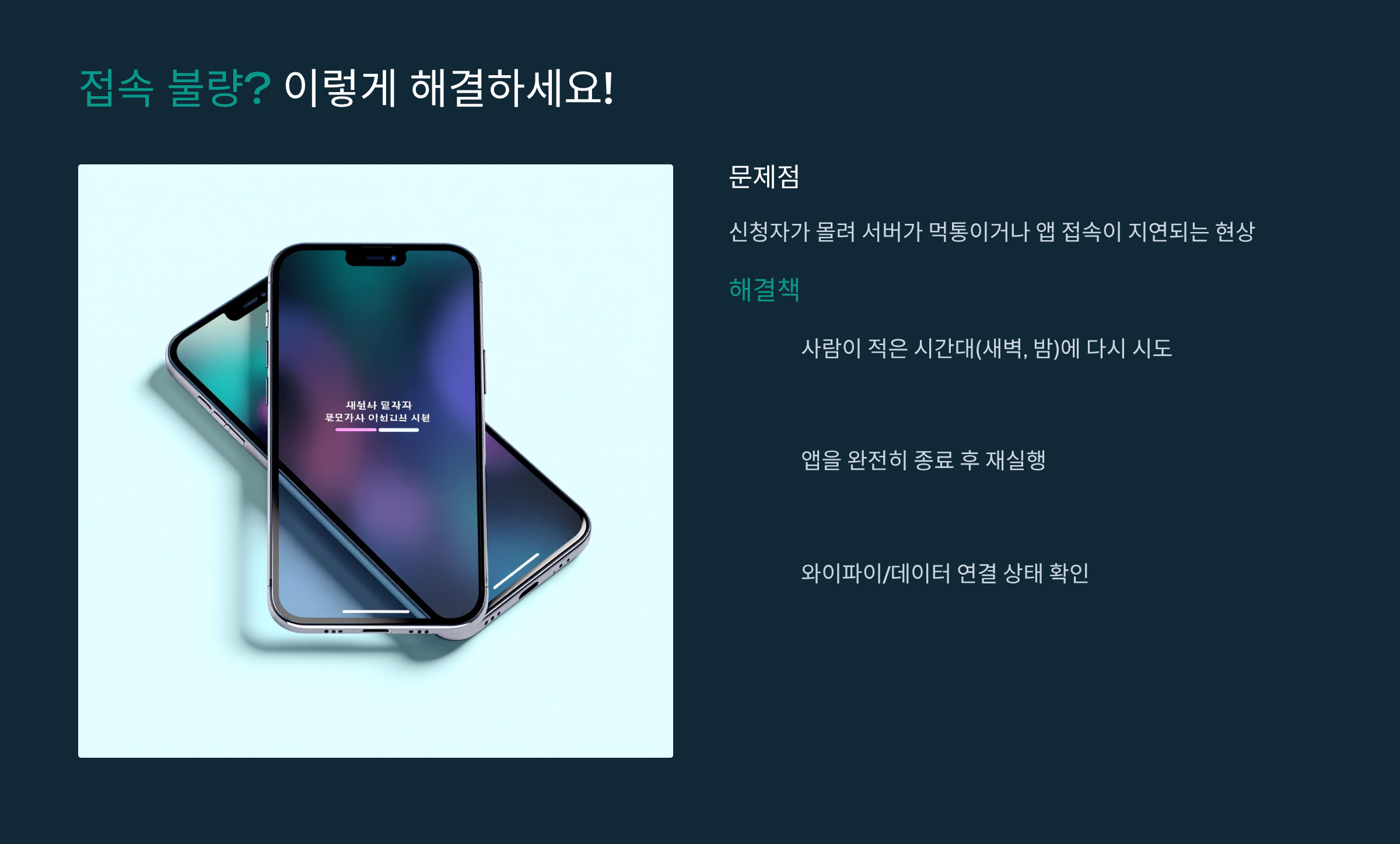 - 해결법: 대부분의 경우 일시적인 서버 과부하로 인한 문제이므로, 잠시 기다렸다가 다시 시도하는 것이 가장 좋은 방법입니다. 특히 신청 시작 직후나 특정 요일에 접속자가 많으니, **접속자가 적은 시간대(새벽, 밤 늦은 시간)**를 활용해 보세요.