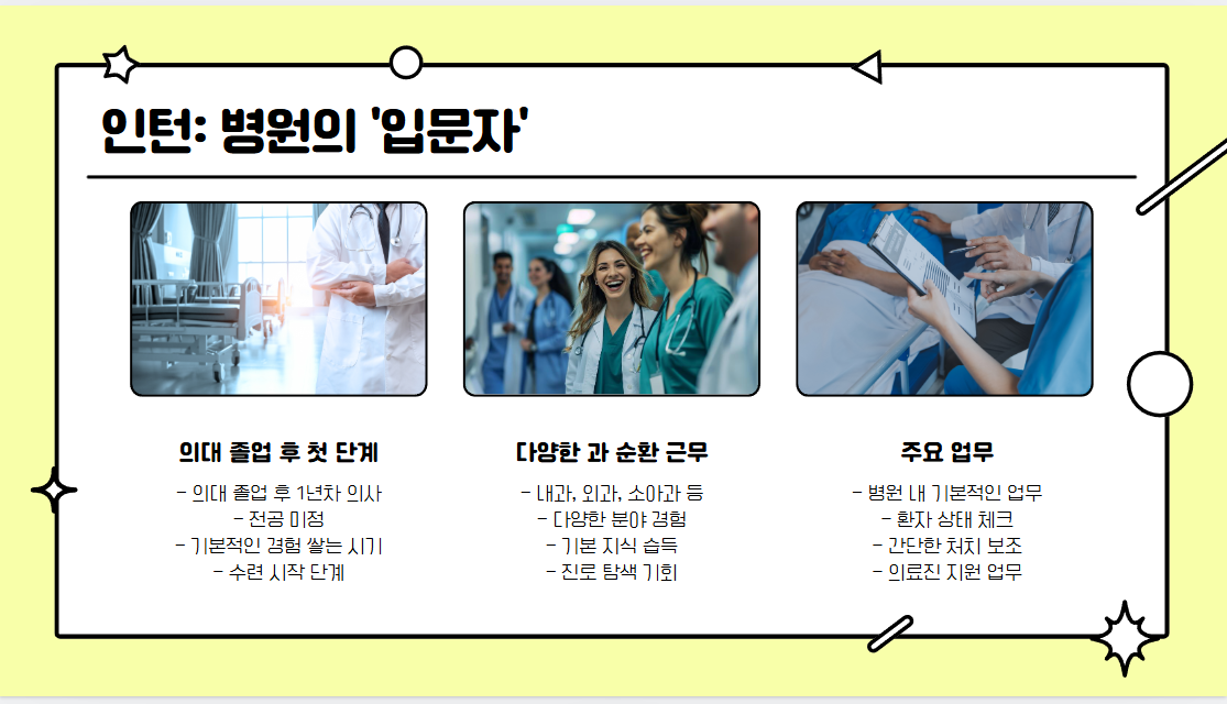 의대 졸업 후 처음으로 병원에서 수련을 시작하는 1년 차 의사를 ‘인턴’이라고 합니다. 아직 전공이 정해지지 않았기 때문에 내과, 외과, 소아과 등 다양한 과를 돌아가며 기본적인 경험을 쌓는 시기입니다.