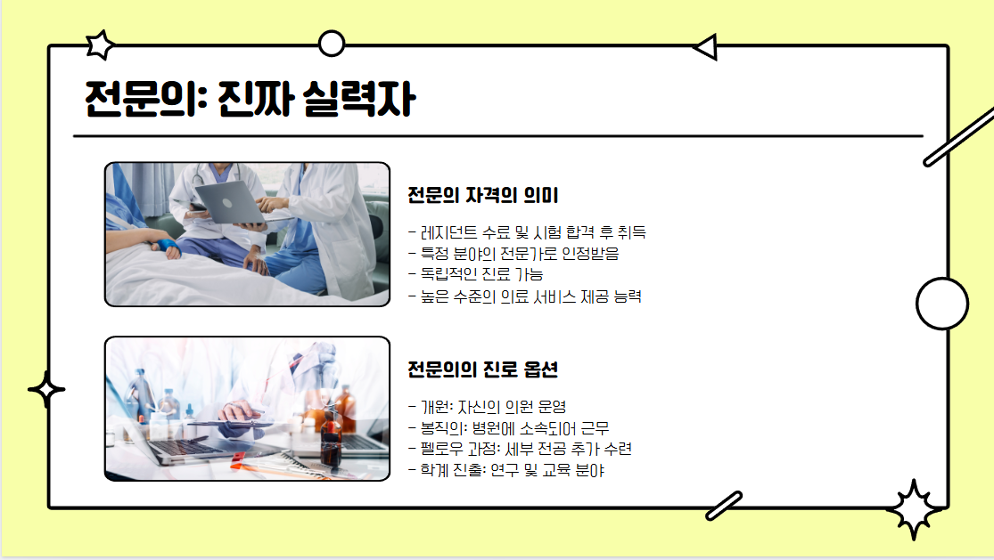 레지던트를 마치고 시험에 합격하면 드디어 ‘전문의’가 됩니다. 예를 들어 내과 전문의, 외과 전문의, 피부과 전문의 등으로 세분화되죠.