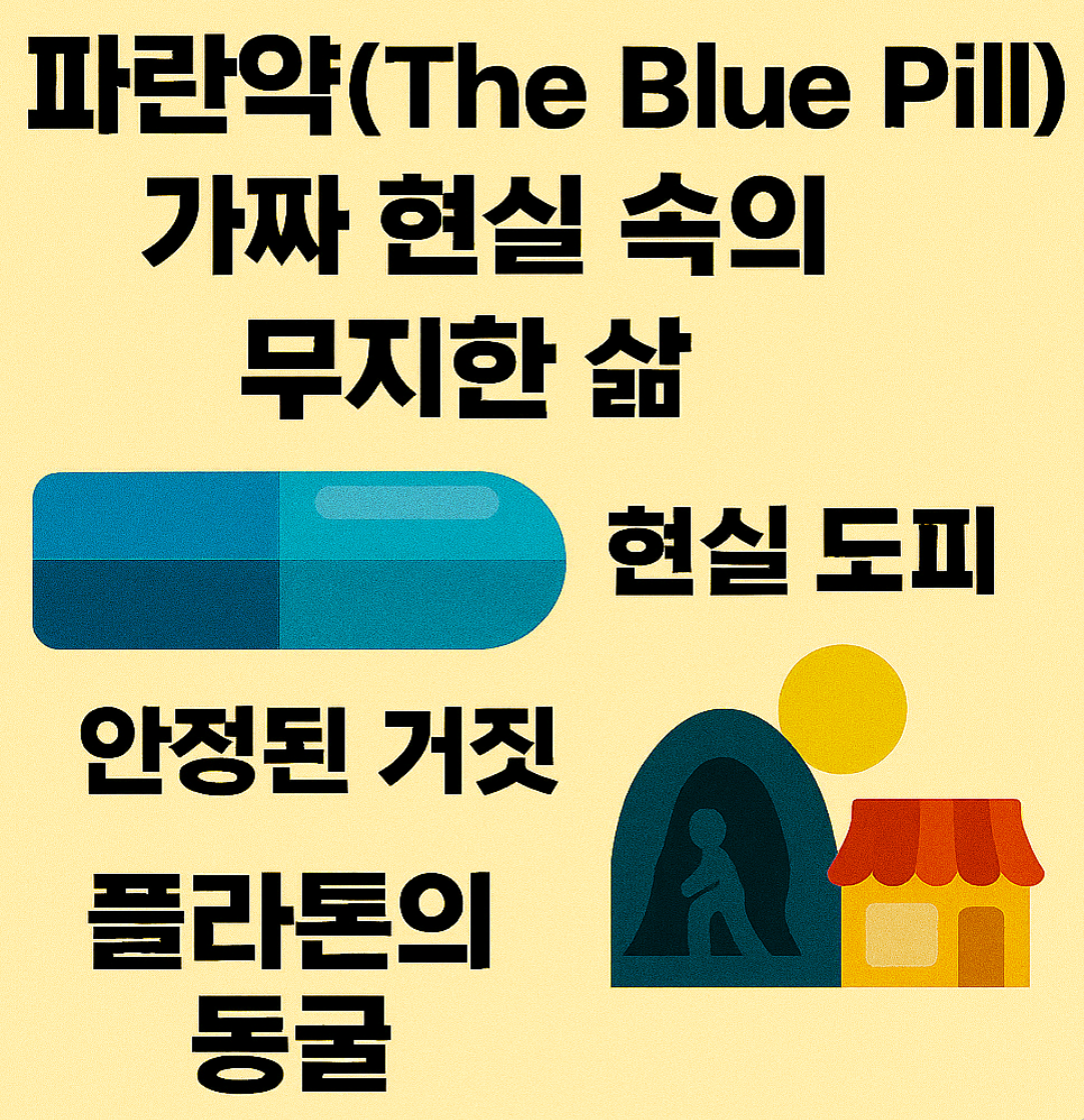 - 🔵 파란약 (The Blue Pill): 달콤하고 안락한 가짜 현실(매트릭스) 속에 남아 무지한 채로 살아가기를 선택합니다. '현실 도피'와 '안정된 거짓'을 상징합니다.