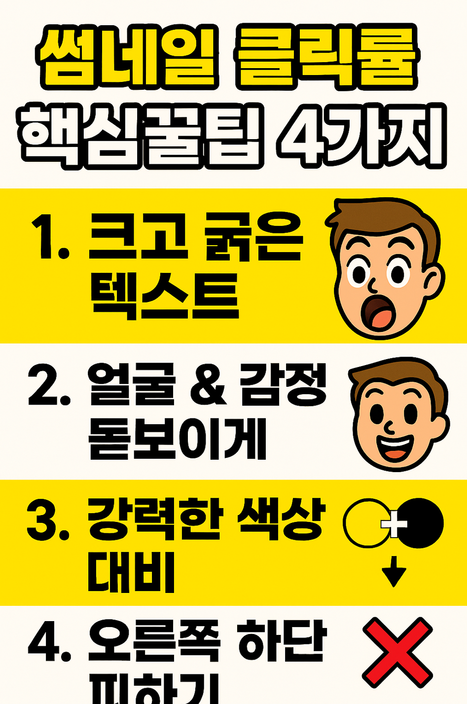 | 1. 텍스트는 '크고 굵게' | 시청자는 썸네일을 스마트폰의 작은 화면으로 봅니다. 텍스트는 핵심 키워드 6~7자 이내로 줄이고, 굵은 폰트를 사용해 한눈에 박히게 해야 합니다. |