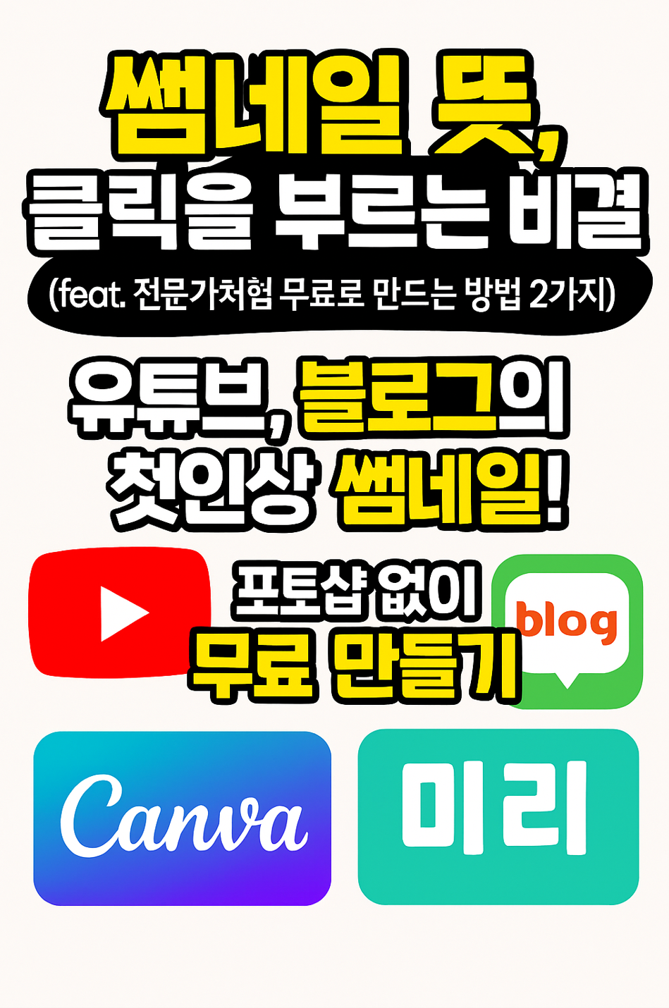 오늘은 '썸네일'의 정확한 뜻과, 포토샵 없이도 전문가처럼 무료로 썸네일을 만드는 방법(미리캔버스, 캔바), 그리고 클릭률 높이는 꿀팁까지 알아봤습니다.