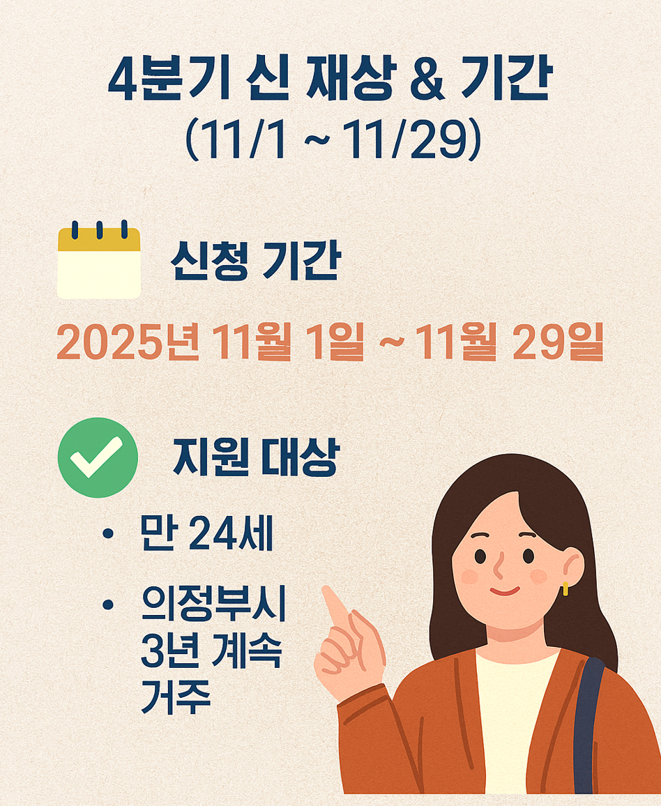 - 지원 대상: 의정부시 거주 만 24세 청년 (경기도 3년 이상 계속 또는 합산 10년 이상 거주 필수)
