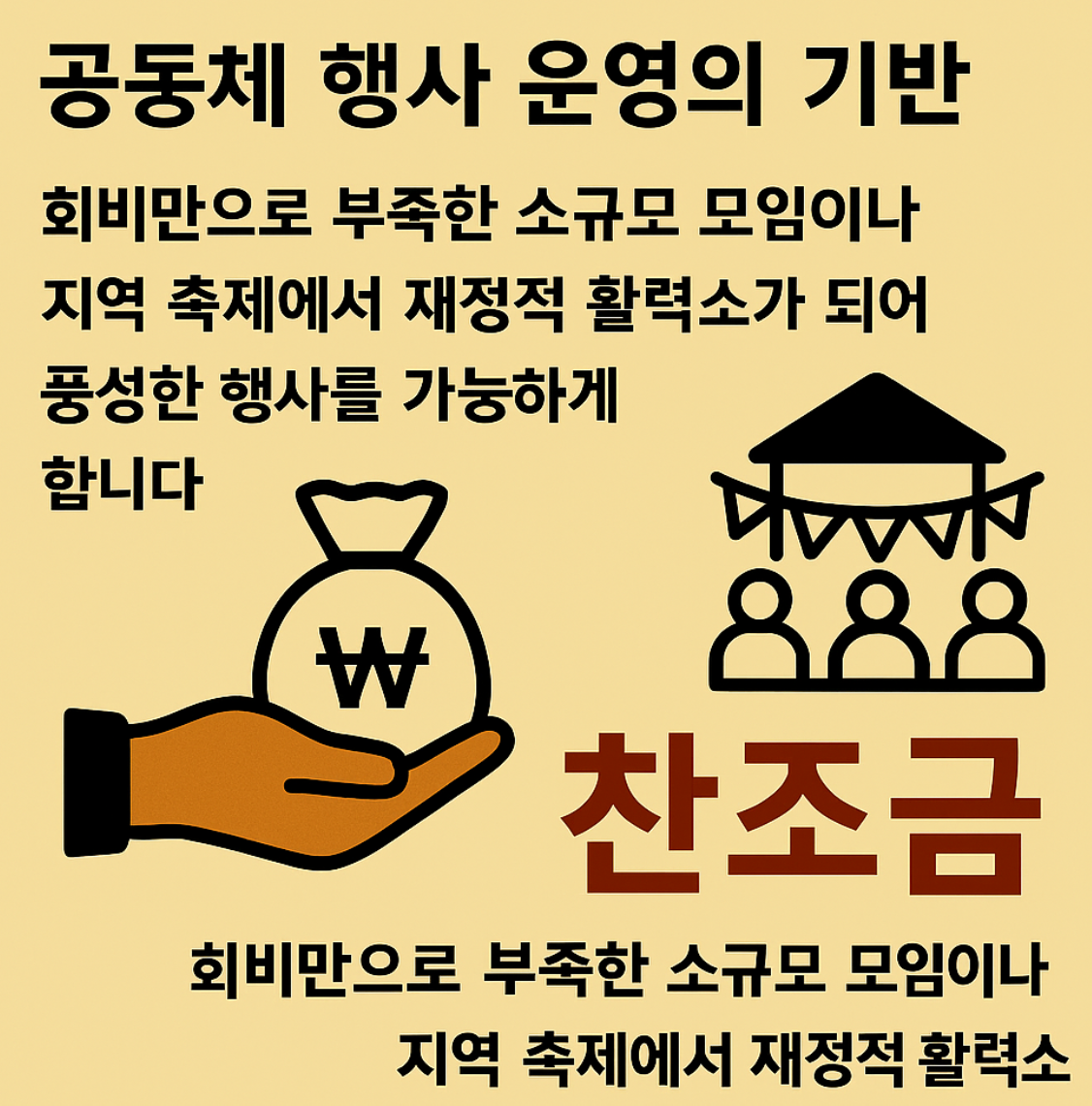 - 공동체 행사 운영의 기반: 회비만으로 부족한 소규모 모임이나 지역 축제에서 재정적 활력소가 되어 풍성한 행사를 가능하게 합니다.