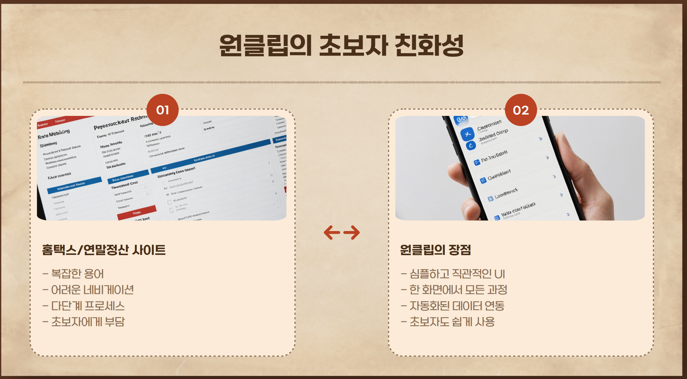 솔직히 말해서 홈택스나 연말정산 사이트는 처음엔 너무 복잡했어요. 용어도 어렵고, 어디서 뭘 클릭해야 할지 모르겠더라고요. 그런데 원클립은 딱 봐도 심플하고 직관적인 UI 덕분에 처음 접하는 사람도 쉽게 따라할 수 있어요. 한 화면에서 소득자료, 인증서 등록, 환급 신청까지 흐름이 쭉 연결되니 혼란 없이 진행할 수 있었죠.