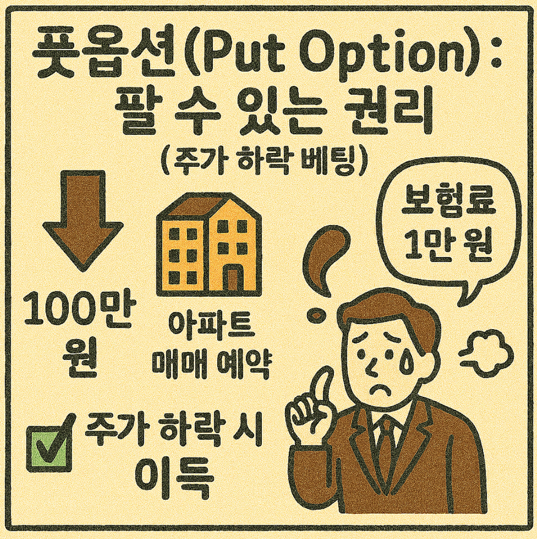 - 행동: 당신은 보험료(옵션 가격) 1만 원을 내고, 3개월 뒤 이 주식을 100만 원에 팔 수 있는 권리를 삽니다.