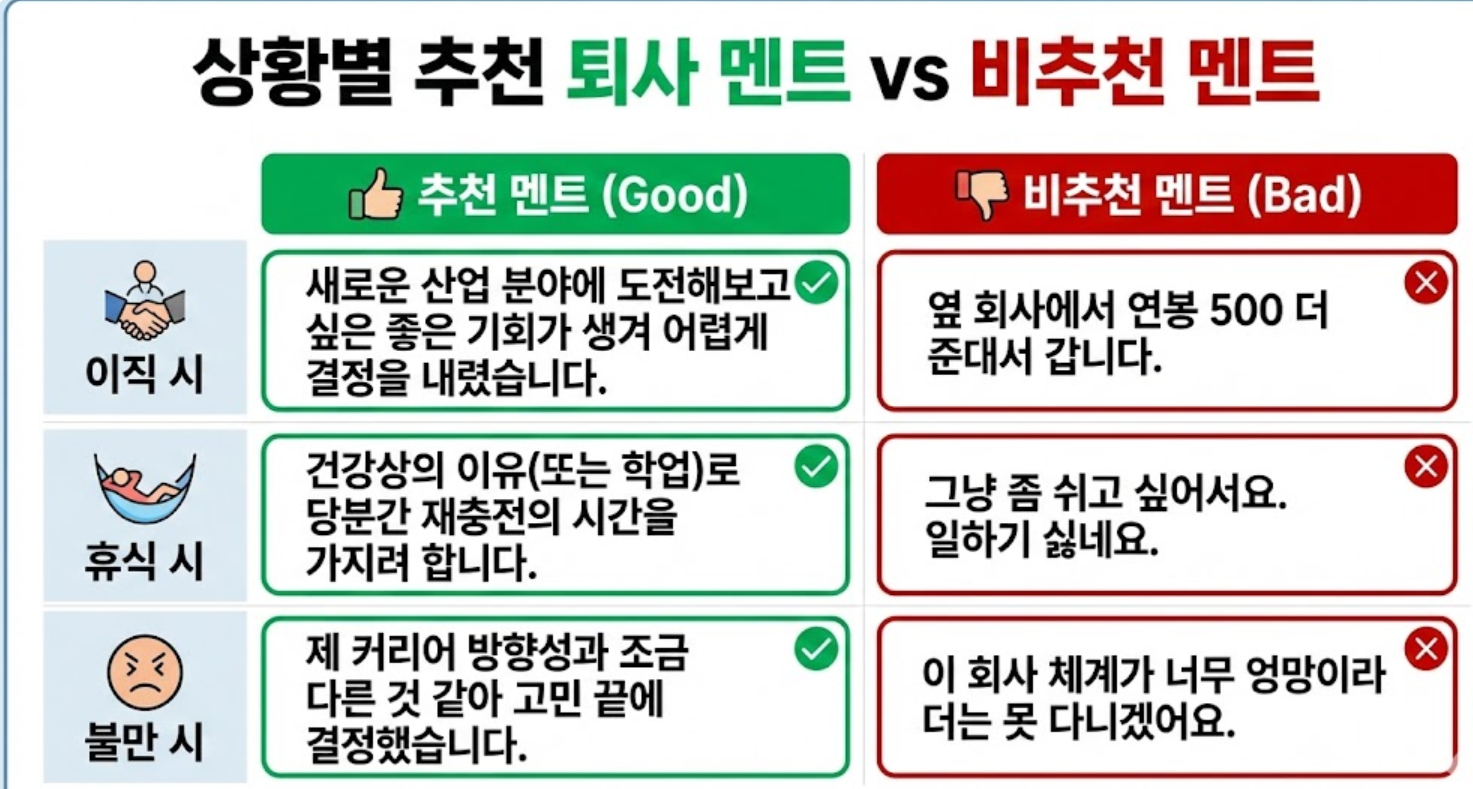 | 휴식 시 | "건강상의 이유(또는 학업)로 당분간 재충전의 시간을 가지려 합니다." | "그냥 좀 쉬고 싶어서요. 일하기 싫네요." |