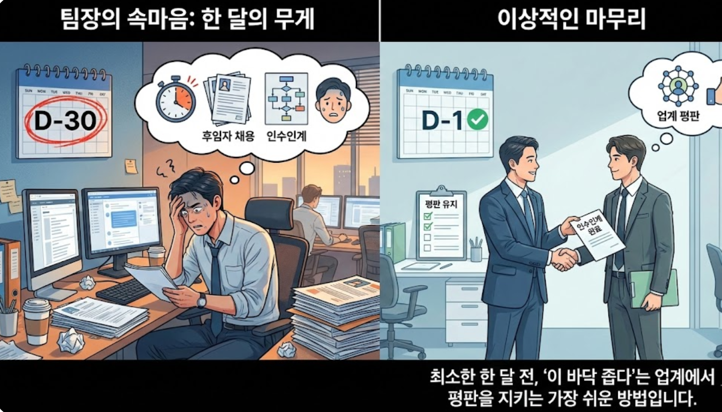 팀장 입장에서 '한 달'은 후임자를 뽑고 인수인계를 받기에 정말 빠듯한 시간입니다. 최소한 한 달 전에 말씀해주시는 것이 '이 바닥 좁다'는 업계에서 평판을 지키는 가장 쉬운 방법입니다.