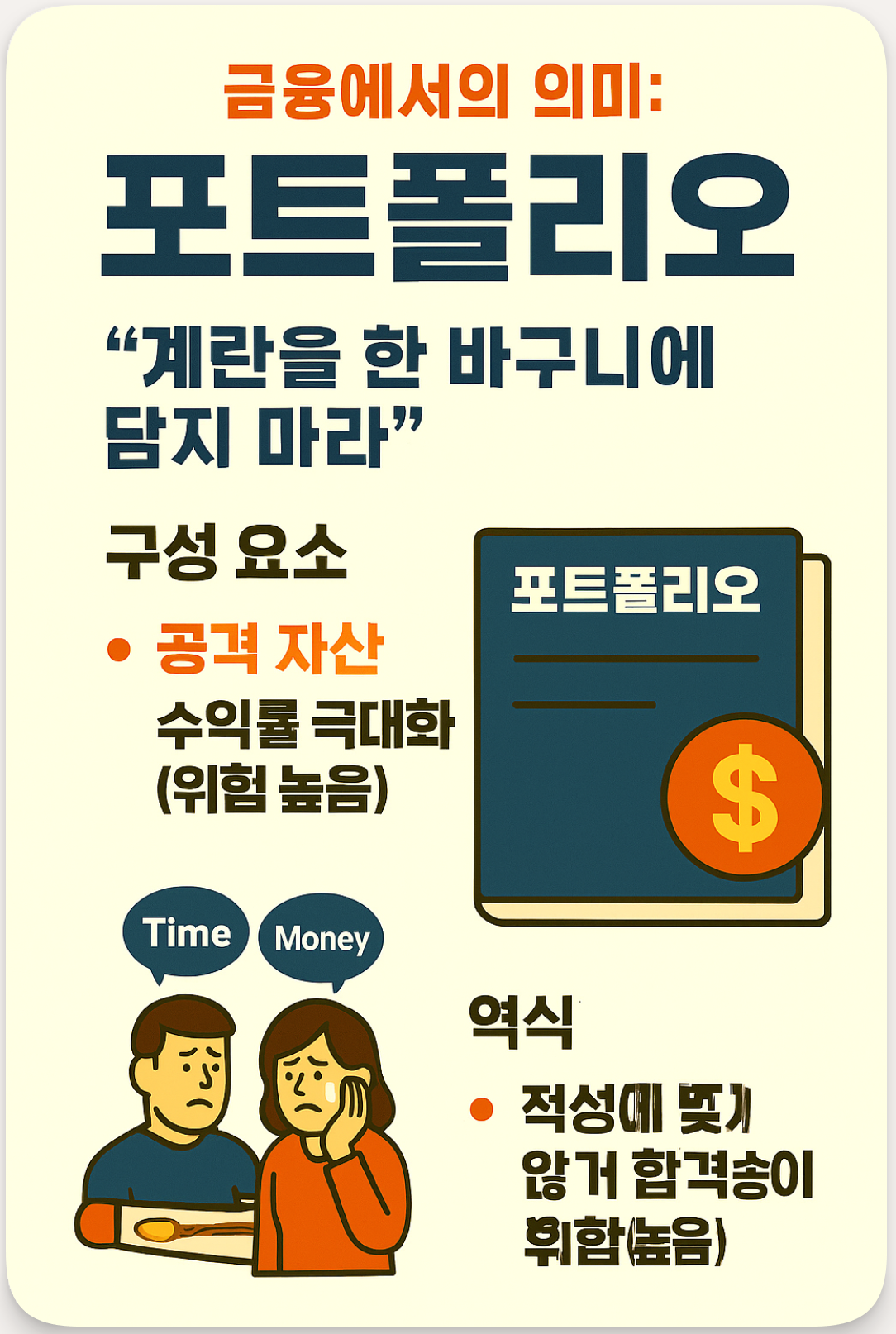 예를 들어 "제 포트폴리오는 주식 60%, 채권 30%, 현금 10%입니다"라고 말한다면, 자신의 자산을 어떻게 나누어 관리하고 있는지 보여주는 것입니다.