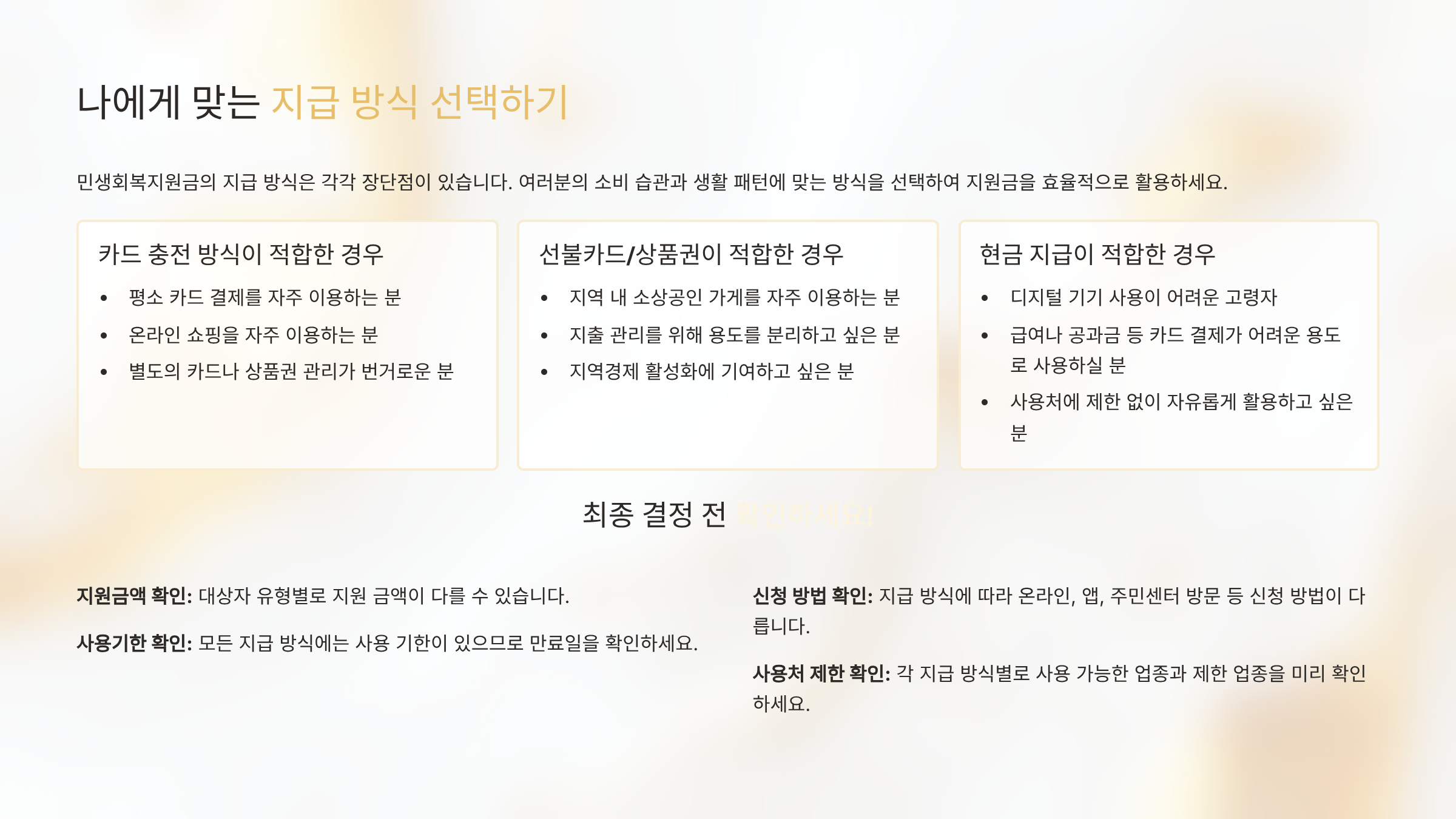 민생회복지원금은 신청자가 원하는 지급 방식을 직접 선택할 수 있어요. 크게 세 가지가 있는데요, 각각 장단점이 있으니 꼼꼼히 따져보고 결정하는 게 좋겠죠?