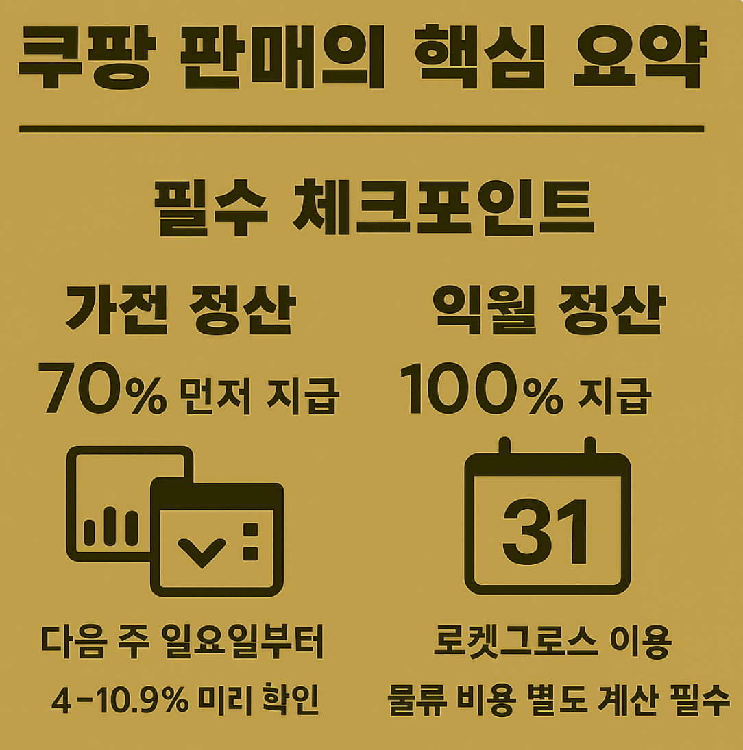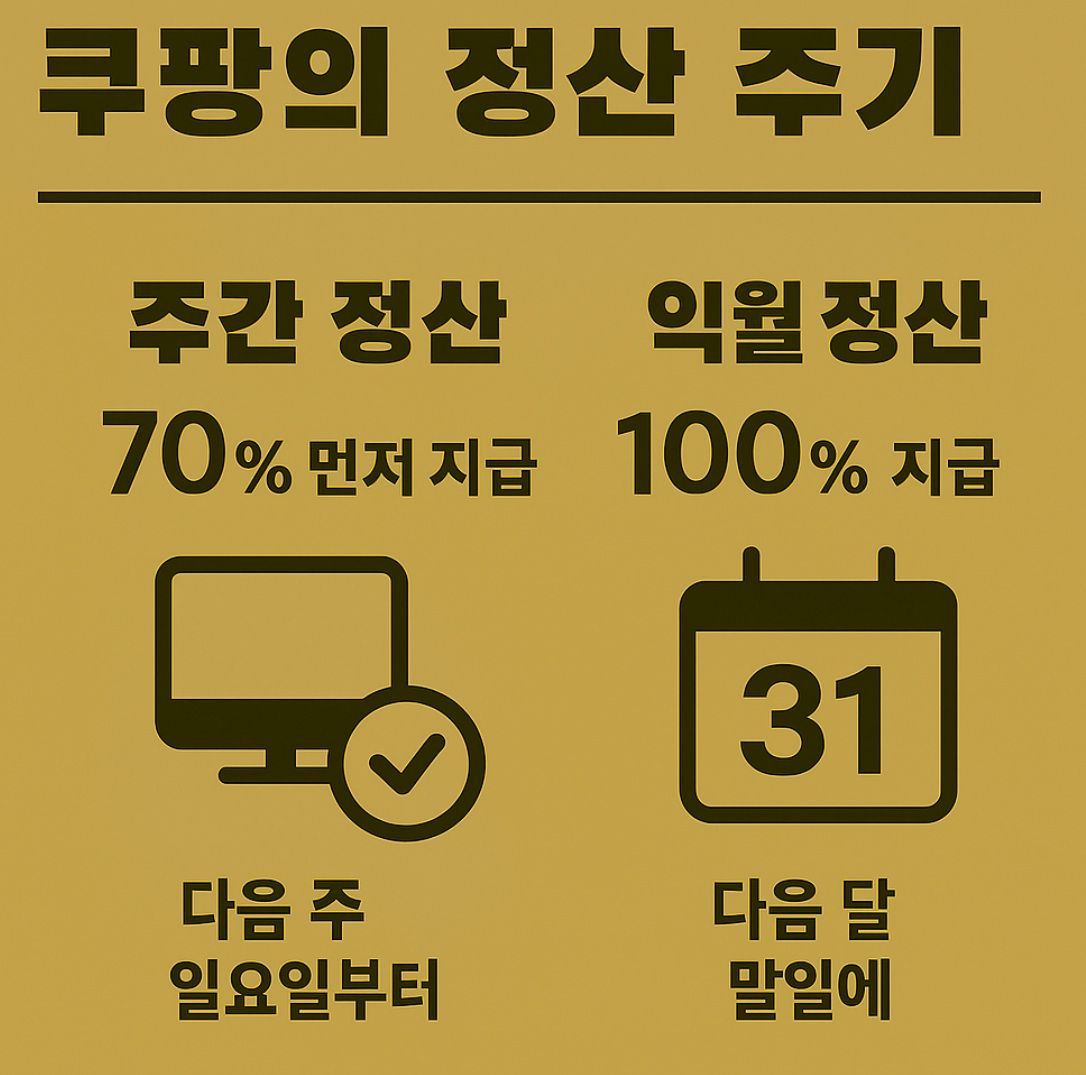 쿠팡 판매에서 수수료만큼 중요한 것이 바로 '정산 주기'입니다. 쿠팡은 정산이 꽤 느린 편에 속하므로 현금 흐름 관리가 생명입니다.