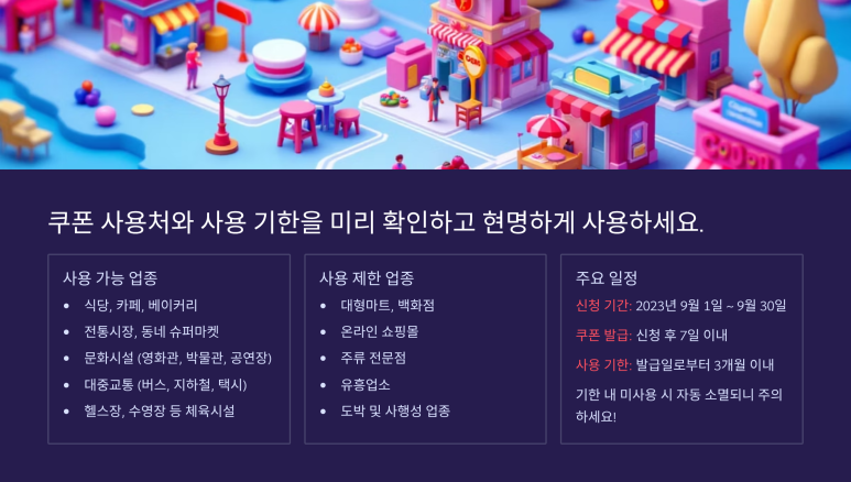 A: 일반적으로 대형마트, 백화점, 온라인 쇼핑몰 등 일부를 제외한 지역 내 소상공인 점포에서 사용할 수 있습니다. 구체적인 사용처는 지자체별로 공고 내용을 확인해야 합니다.