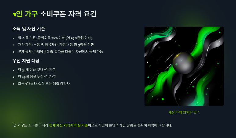 1인가구는 소득은 낮지만, 보유한 재산(예: 전세 보증금, 주식, 예금 등) 때문에 지원 대상에서 제외되는 경우가 종종 발생합니다. 이번 2차 쿠폰은 소득 기준과 함께 '재산 기준'이 함께 적용될 가능성이 크니, 이 부분을 반드시 체크해야 합니다.