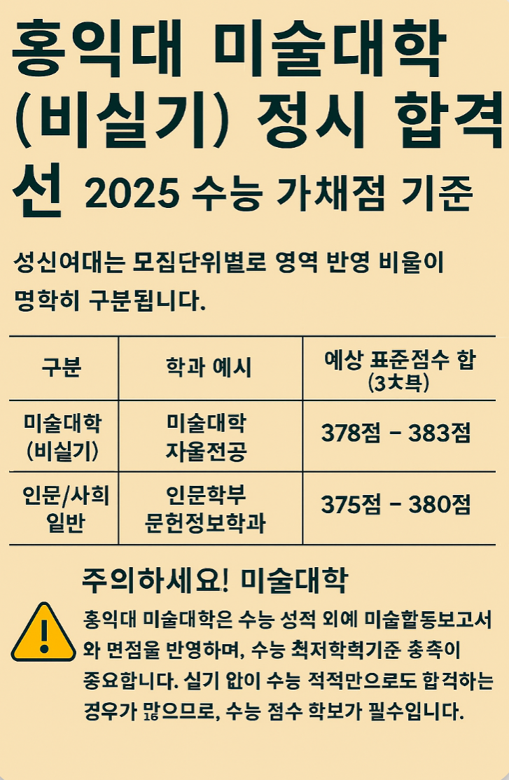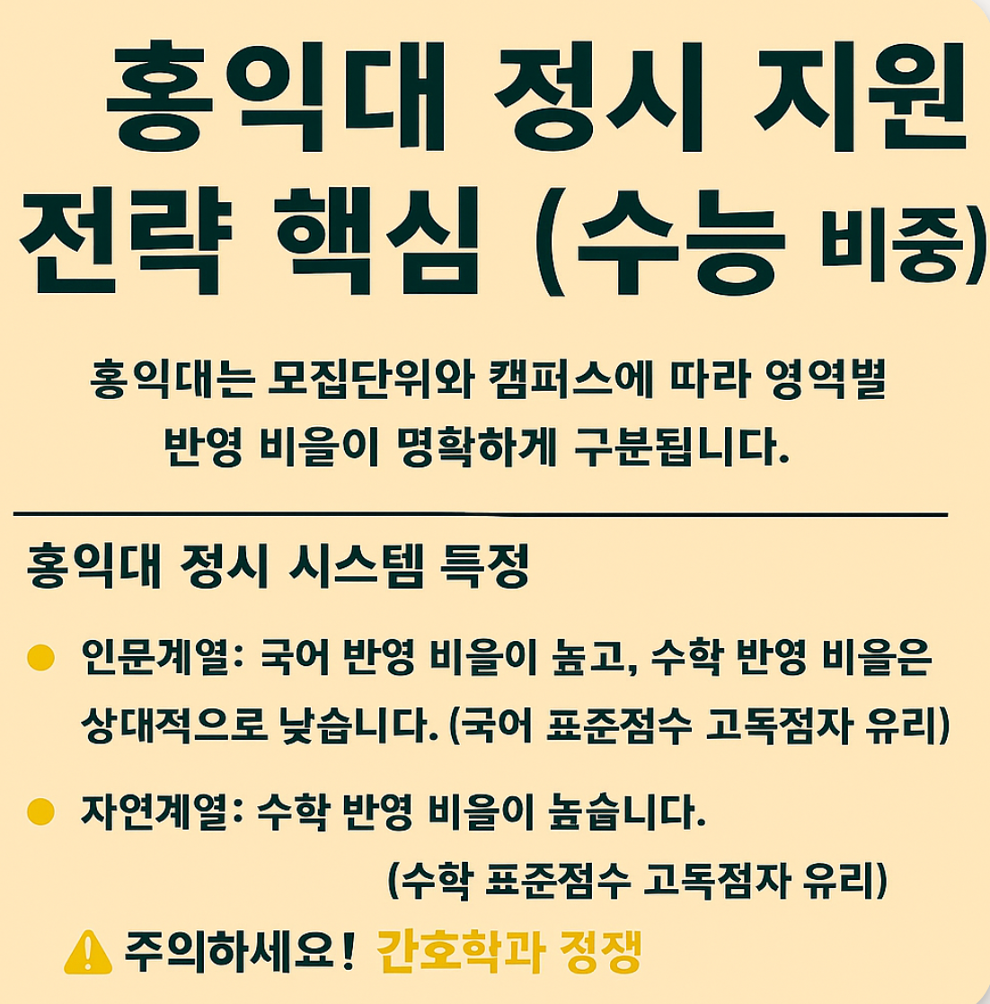 따라서 홍익대에 지원하려면 강점 과목(인문:국어, 자연:수학)을 중심으로 표준점수를 확보하고, 미술대학 지원 시에는 수능 성적과 함께 미술활동보고서 준비에 만전을 기해야 합니다.