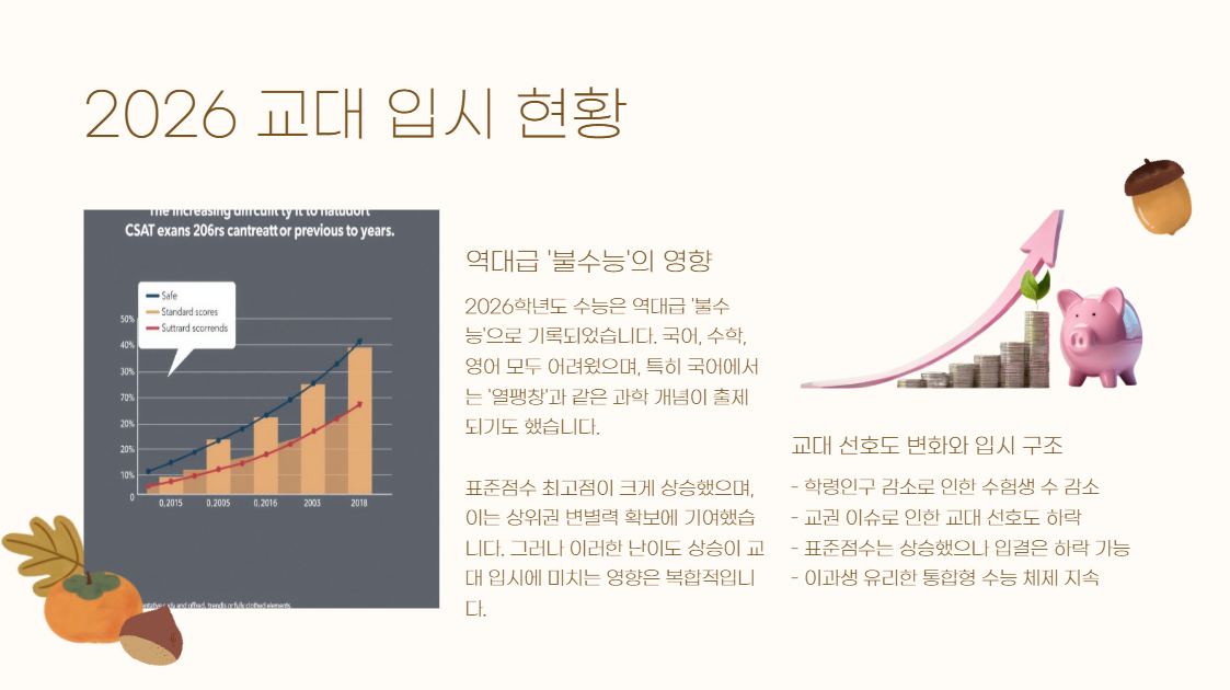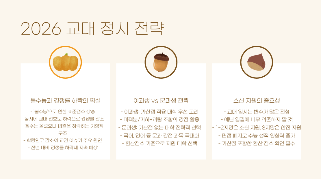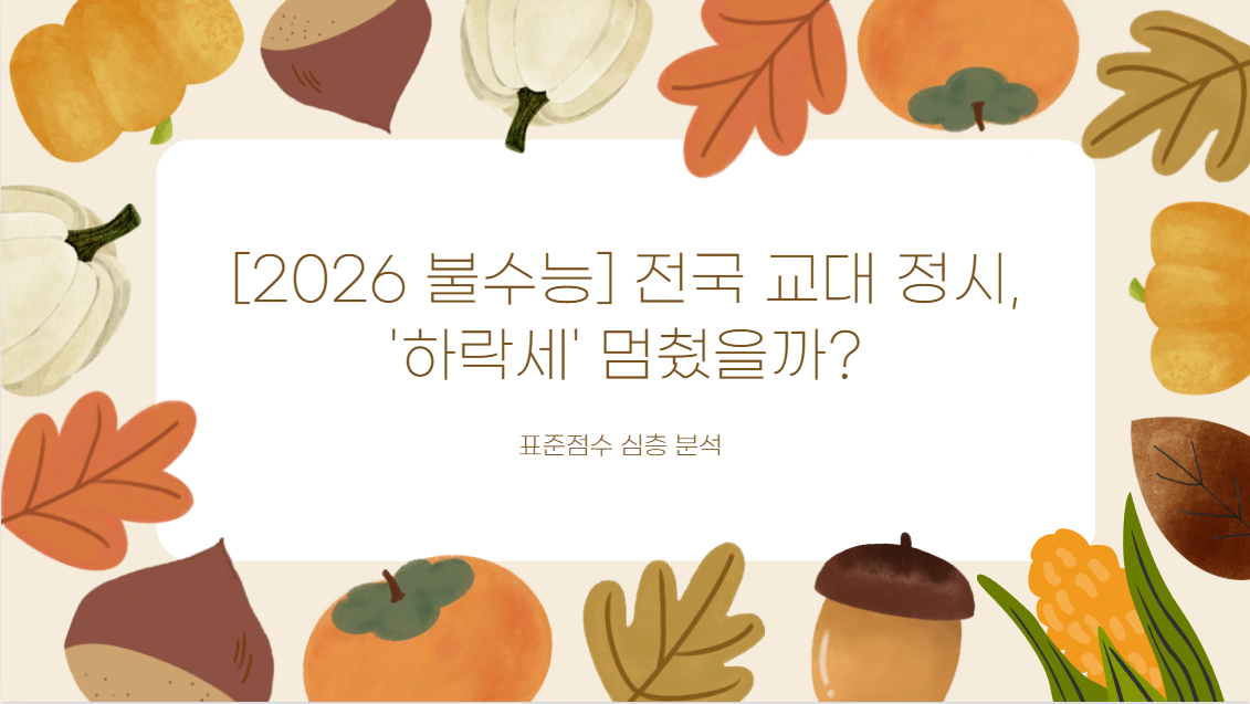 2026학년도 교대 입시는 '불수능으로 인한 표점 상승'과 '경쟁률 하락'이 동시에 작용하는 해입니다. 예전처럼 '올 1등급'이어야만 가는 곳은 아니지만, 그렇다고 '누구나' 갈 수 있는 곳도 아닙니다.