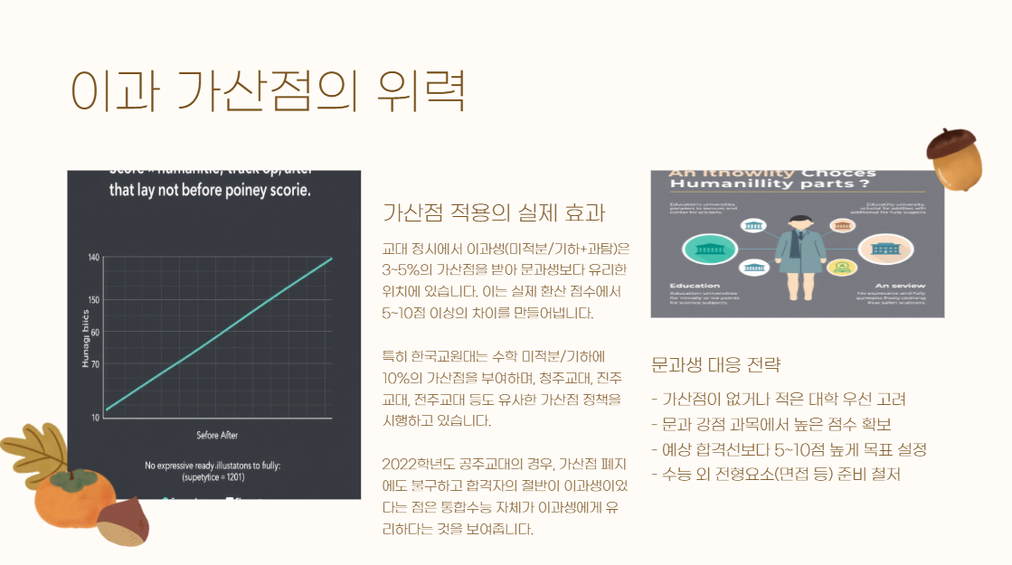 1. 이과생 가산점: 많은 교대가 수학(미적분/기하) 및 과탐 응시자에게 3~5%의 가산점을 부여합니다. 문과생(확통+사탐)은 표점 총합이 높아도 환산 점수에서 밀릴 수 있습니다.