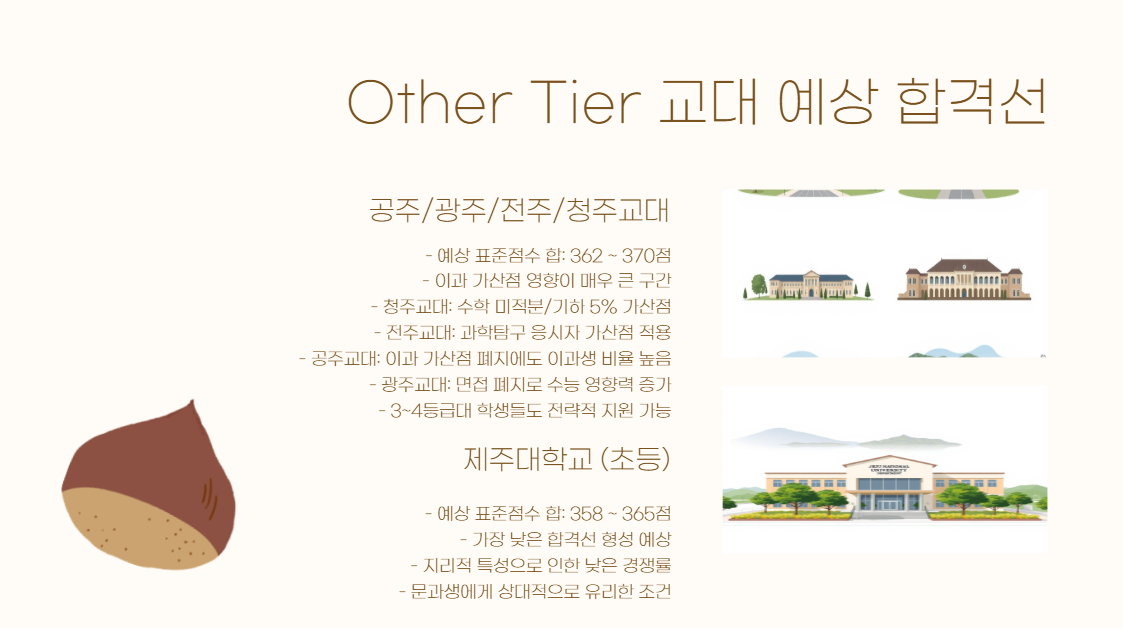 | 제주대학교 (초등) | 358 ~ 365점 | 가장 낮은 합격선 형성 예상 |