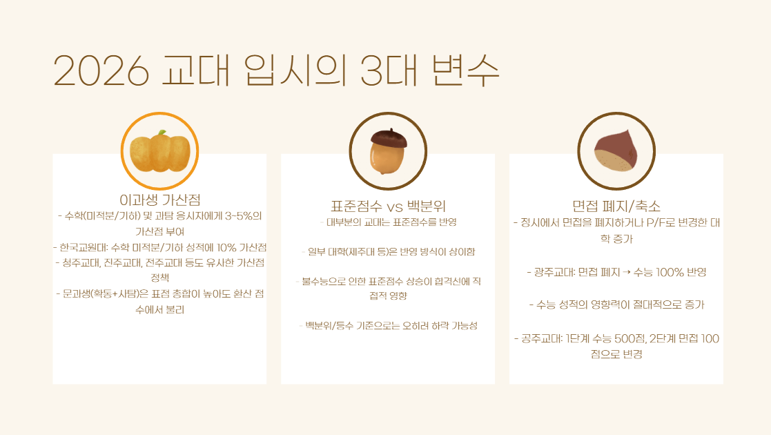 특히 교대 지원자의 대다수를 차지하는 문과생들은, 이과생의 가산점 침공을 방어할 수 있는 대학(가산점이 없거나 적은 곳)을 전략적으로 찾아야 합니다. 여러분의 꿈을 응원합니다! 궁금한 점은 댓글로 남겨주세요.