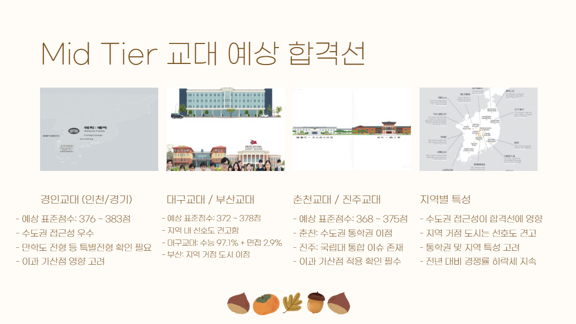 | 춘천교대 / 진주교대 | 368 ~ 375점 | 수도권 통학권 / 국립대 통합 이슈 |