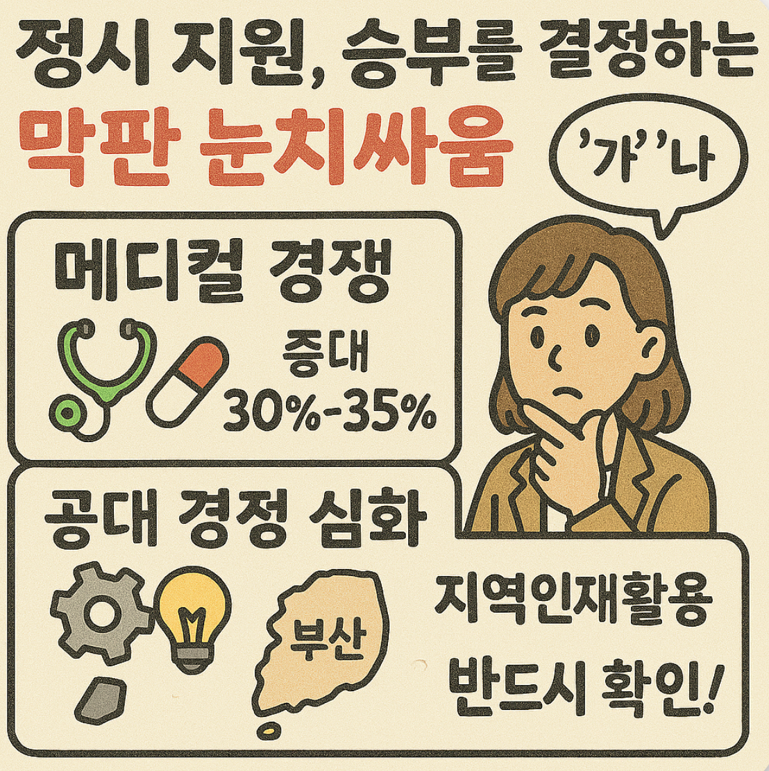 - 메디컬 경쟁: 의대, 치대, 약대는 전국 최상위권 학생들의 지원이 몰려 합격선이 매우 높게 형성됩니다.
