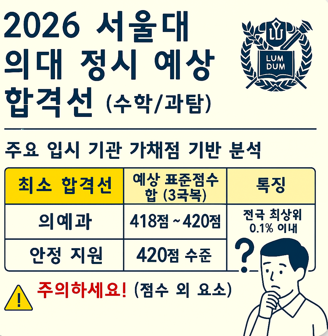 2026학년도 수능 이후, 서울대 의과대학 정시 합격을 논하는 것은 단순한 점수 싸움이 아닌, 전 과목 만점 수준의 안정적인 고득점과 까다로운 지원 자격 충족을 의미합니다.