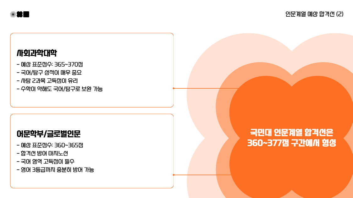 국민대 인문계열은 탐구 반영 비율이 30%로 높은 편입니다. 수학이 조금 약하더라도 사탐 2과목을 잘 봤다면(백분위 85~90% 이상), 환산 점수에서 이과생을 방어하고 합격할 가능성이 높습니다.