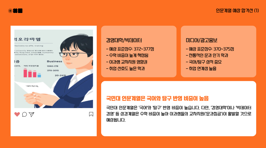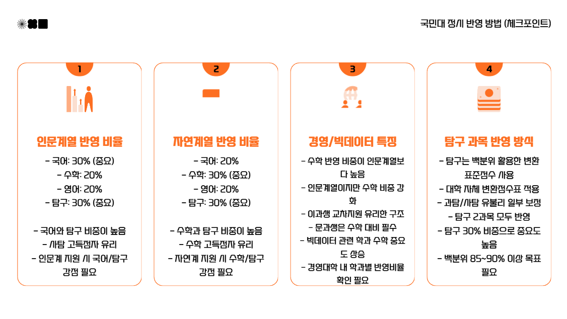국민대 인문계열은 '국어'와 '탐구' 반영 비중이 높습니다. 다만, '경영대학'이나 '빅데이터경영' 등 상경계열은 수학 비중이 높아 이과생들의 교차지원(문과침공)이 활발할 것으로 예상됩니다.