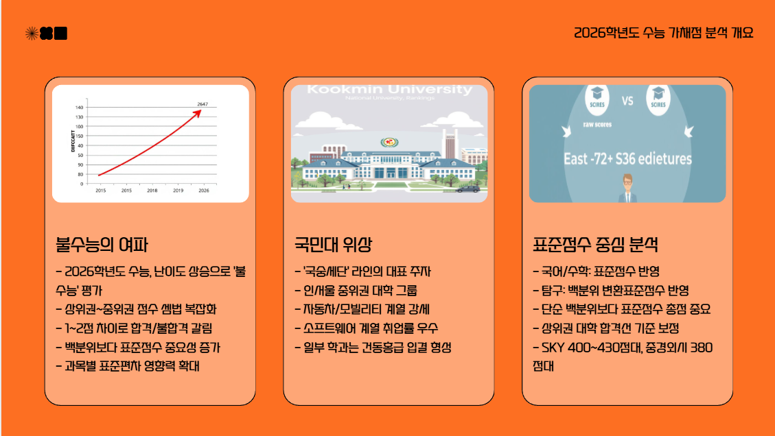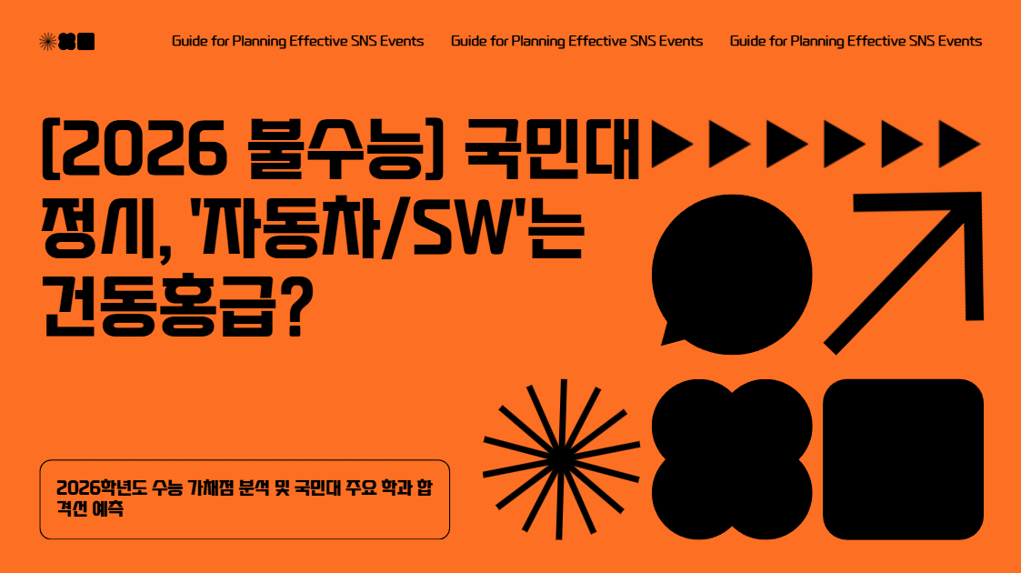 수험생 여러분, 정말 고생 많으셨습니다. 2026학년도 '불수능'의 여파로 상위권부터 중위권까지 점수 셈법이 매우 복잡해졌습니다. 특히 국민대학교는 '국숭세단' 라인의 대표 주자이면서도, 간판 학과인 자동차/모빌리티 및 소프트웨어 계열은 인서울 상위권 대학과 어깨를 나란히 할 정도로 입결 스펙트럼이 넓은 대학입니다.