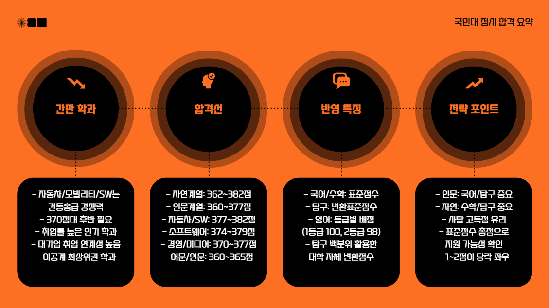 앞서 분석한 상위권 대학 합격선(SKY 400~430점대, 중경외시 380점대)을 기준으로 보정한 '2026 국민대 주요 학과 현실적 합격선'을 공개합니다.