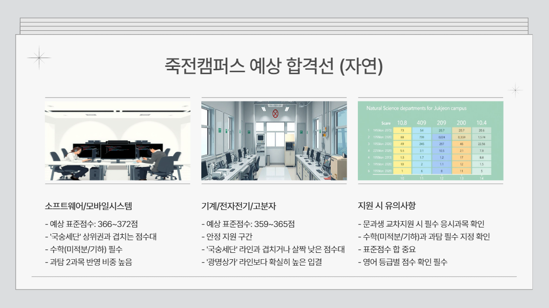 죽전캠퍼스는 소프트웨어학과, 모바일시스템공학 등 IT 계열이 강세입니다. '국숭세' 라인과 겹치거나 살짝 낮은 점수대에서 형성되며, '광명상가' 라인보다는 확실히 높은 입결을 보입니다. (※ 국+수+탐(2) 표준점수 단순 합계 기준)