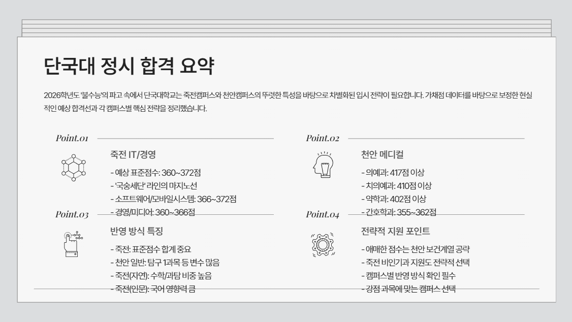 지금부터 가채점 데이터를 바탕으로 보정한 '2026 단국대(죽전/천안) 주요 학과 현실적 예상 합격선'을 공개합니다.