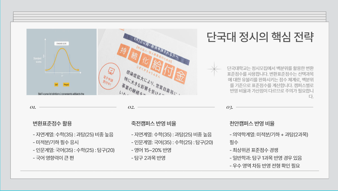 단국대는 백분위를 활용하는 변환표준점수를 사용합니다. 캠퍼스별로 반영 비율과 가산점이 다르니 주의해야 합니다.