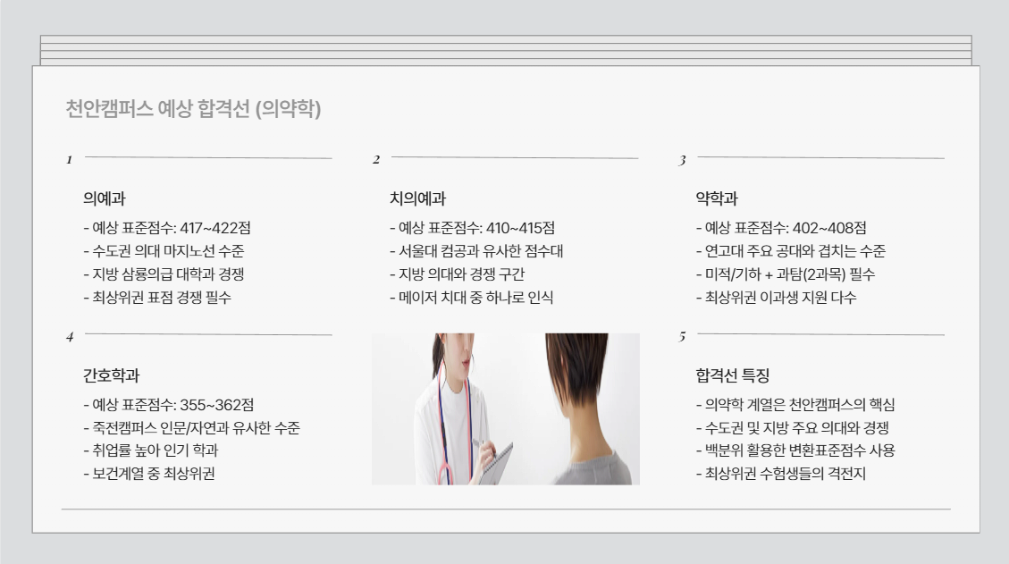 * 천안 (의약학): 미적/기하 + 과탐(2과목) 필수. 최상위권 표점 경쟁.