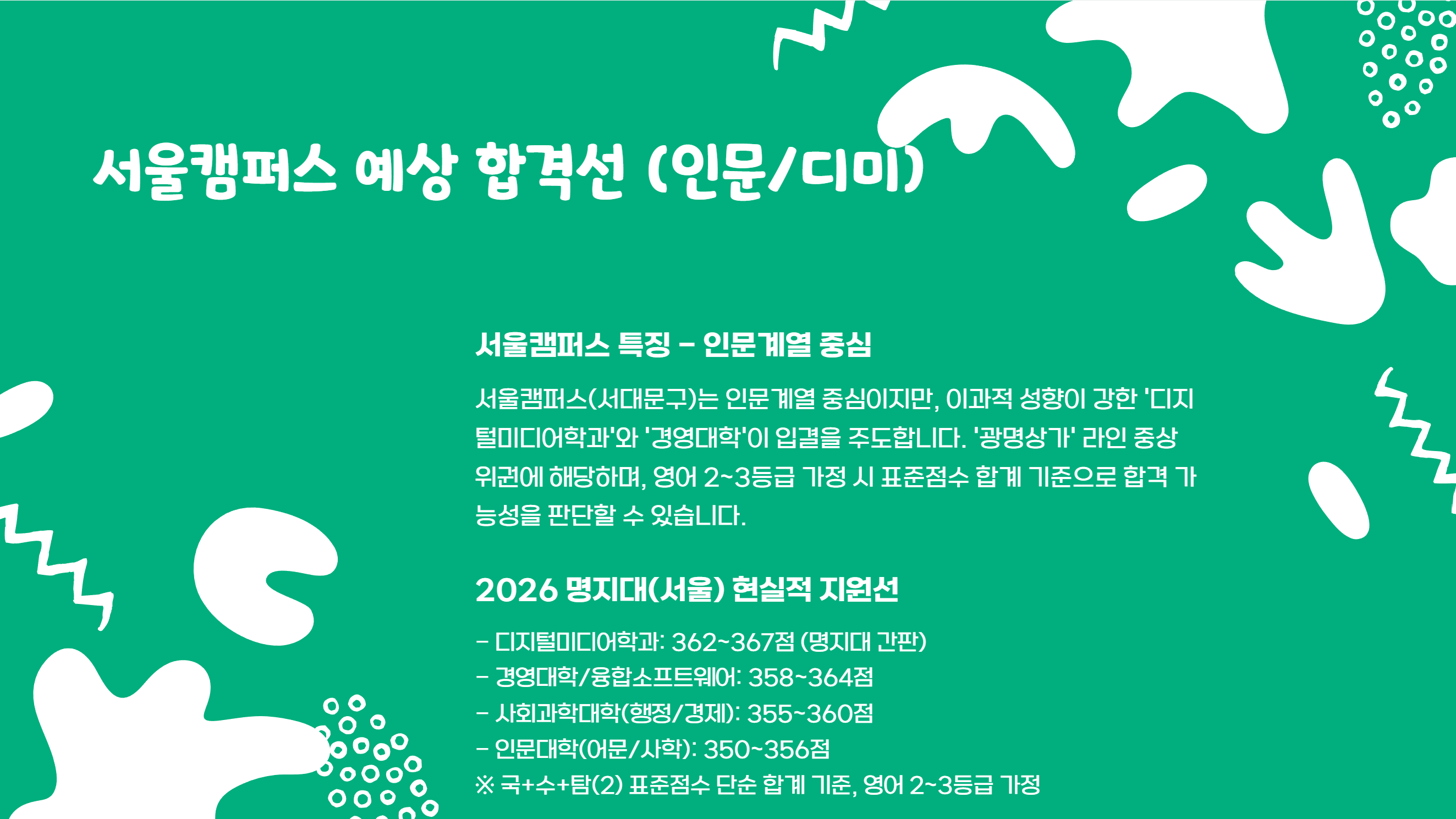 표준점수 총합 350~360점대 학생들은 명지대의 '백분위 반영' 방식이 나에게 유리한지(탐구 평균이 높은지) 반드시 계산해 보셔야 합니다. 여러분의 합격을 진심으로 응원합니다! 궁금한 점은 댓글로 남겨주세요.