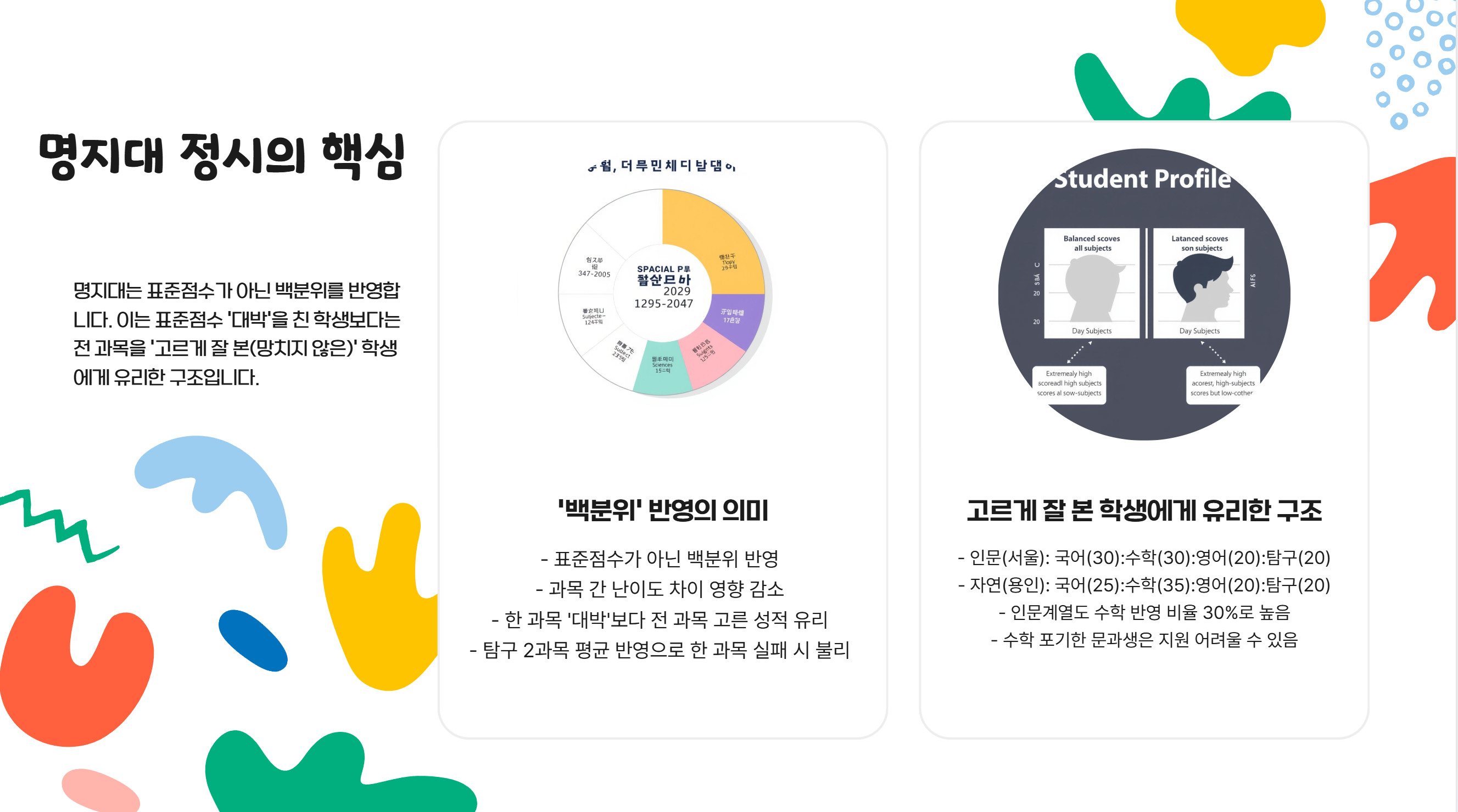 명지대는 표준점수가 아닌 백분위를 반영합니다. 이는 표준점수 '대박'을 친 학생보다는, 전 과목을 '고르게 잘 본(망치지 않은)' 학생에게 유리한 구조입니다.