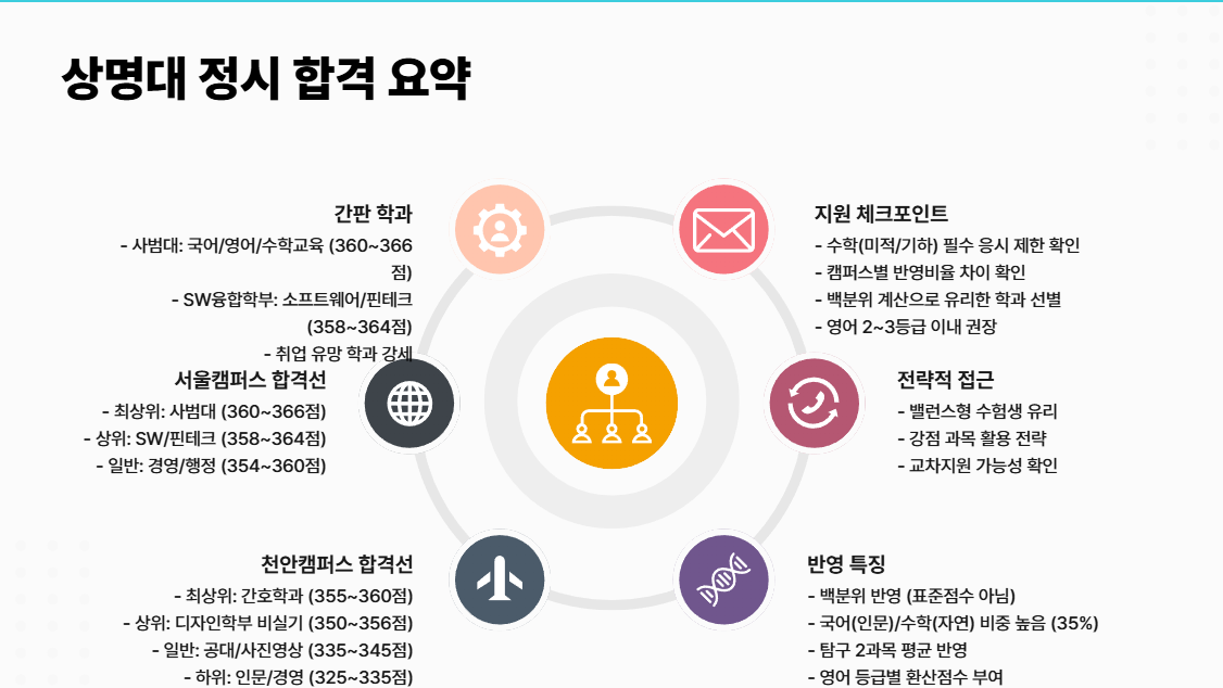 상명대는 '인서울'을 희망하는 3등급대 학생들에게 가장 현실적인 목표 대학 중 하나입니다. 국어(인문) 또는 수학(자연) 중 확실한 강점 과목이 있다면, 전체 총점이 조금 낮더라도 반영 비율을 통해 합격 가능성을 높일 수 있습니다.
