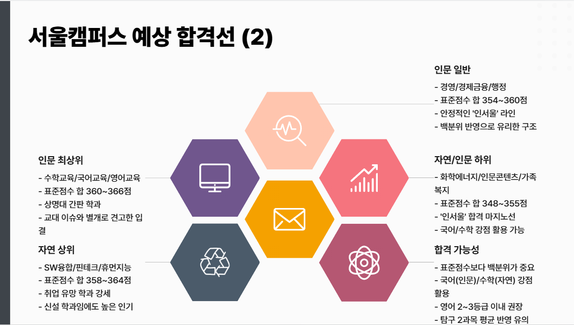 | 인문 (일반) | 경영 / 경제금융 / 행정 | 354 ~ 360점 | 안정적인 인서울 라인. |