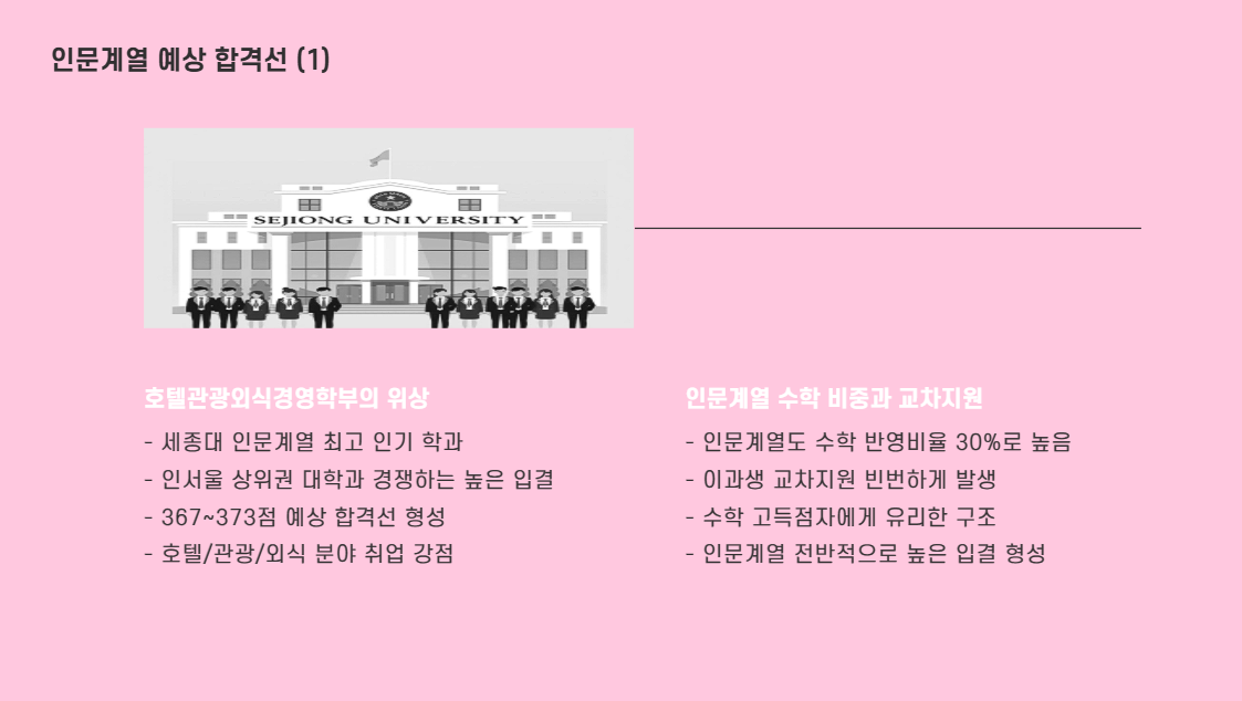 세종대 인문계열의 상징인 '호텔관광외식경영학부'는 인서울 상위권 대학과 경쟁하는 높은 입결을 자랑합니다. 또한, 인문계열 전반적으로 수학 반영 비중이 높아 이과 교차지원이 활발합니다.
