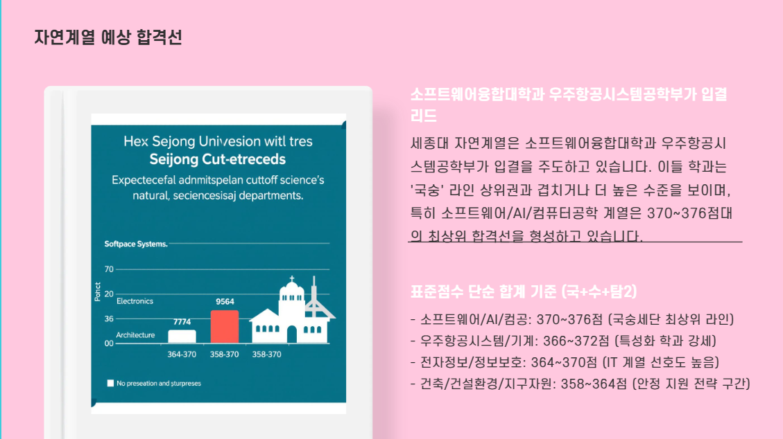 세종대 자연계열은 소프트웨어융합대학과 우주항공시스템공학부가 입결을 리드합니다. 이들 학과는 '국숭' 라인 상위권과 겹치거나 더 높을 수 있습니다. (※ 국+수+탐(2) 표준점수 단순 합계 기준)