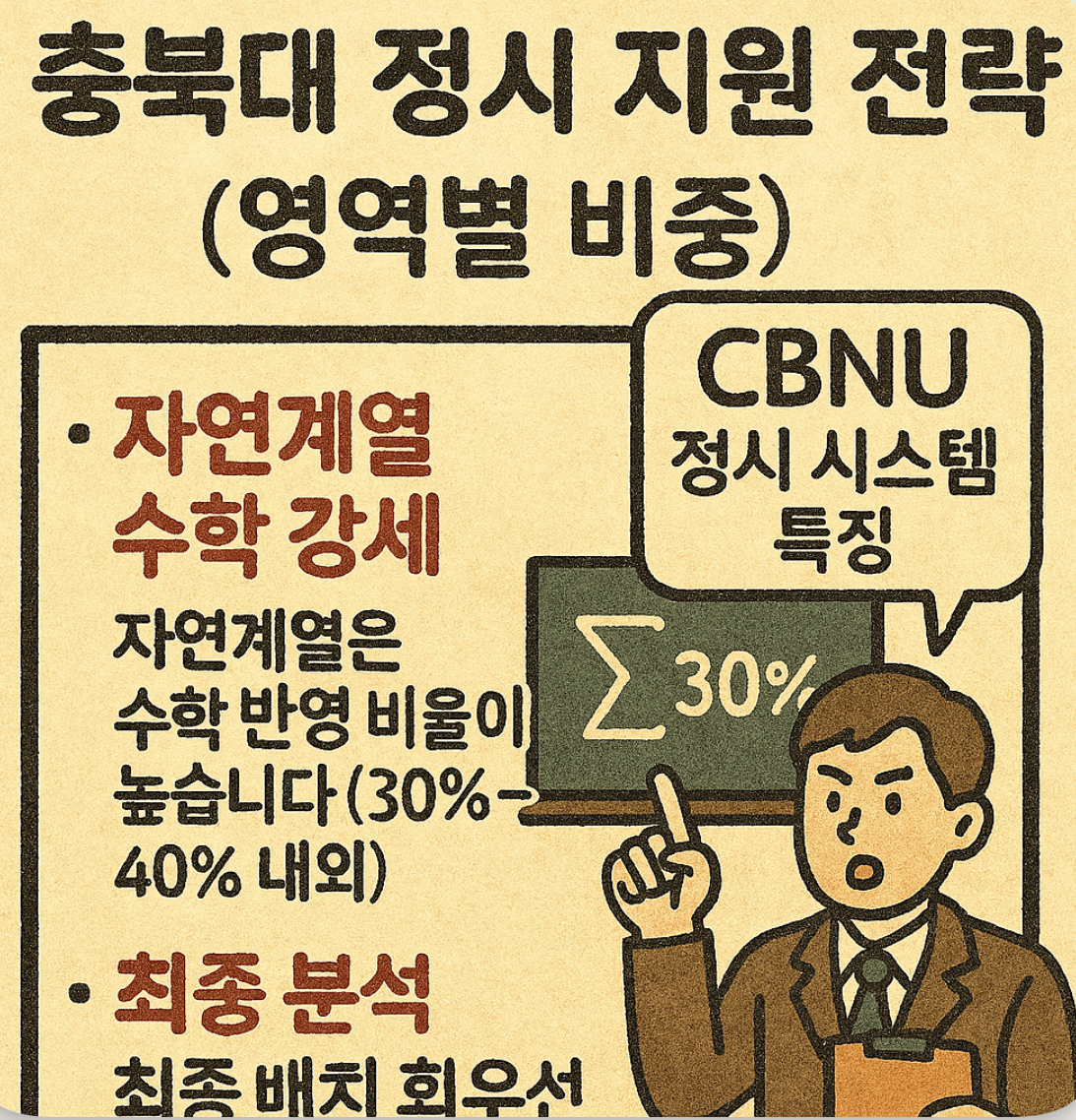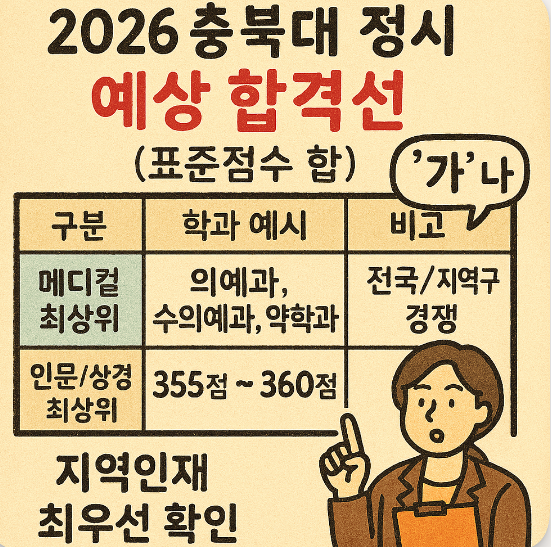 지금까지 2026학년도 충북대 정시 합격선 예측과 전략을 알아보았습니다. 충북대는 '지역인재 전형'이라는 특수성을 이해하고, 자신의 표준점수 강점을 활용하는 것이 중요합니다.