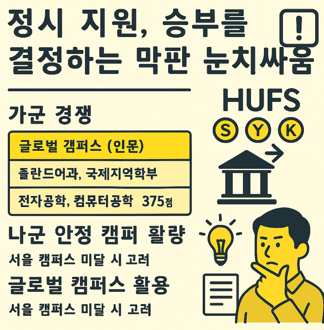한국외대 정시 합격선, 서울 캠퍼스 390점대 예상! 2026 수능 가채점 기준, HUFS 정시의 핵심 지표인 '표준점수'를 바탕으로 주요 어문 계열 및 통상 학과의 예상 커트라인을 분석하고, 서울/글로벌 캠퍼스 지원 전략을 짚어드립니다.