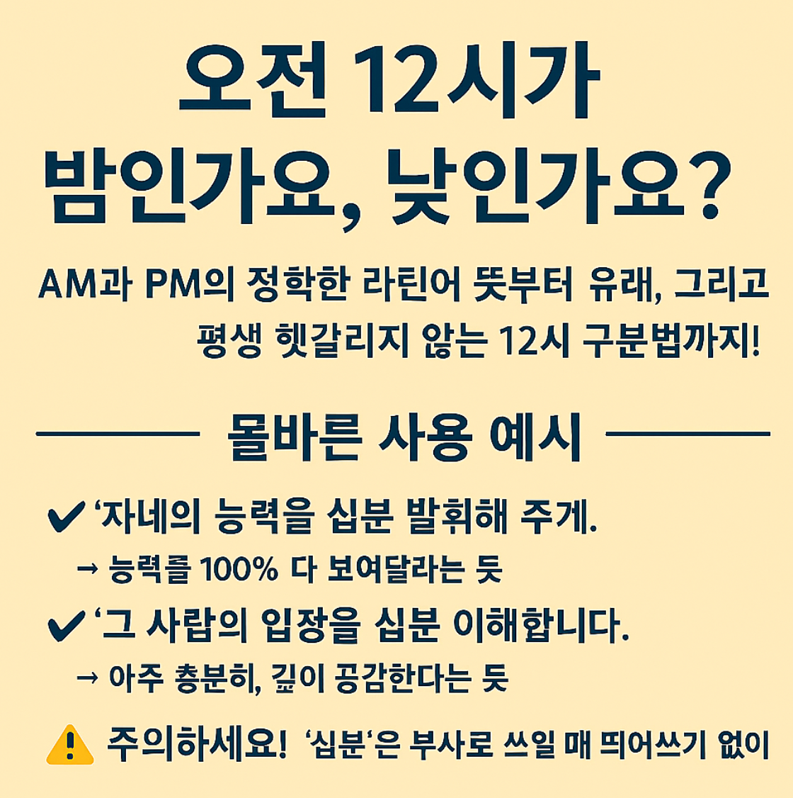 "점심 12시는 AM인가요, PM인가요?" 이 질문이 가장 혼란스러우실 텐데요. 결론부터 말씀드리면 다음과 같습니다.